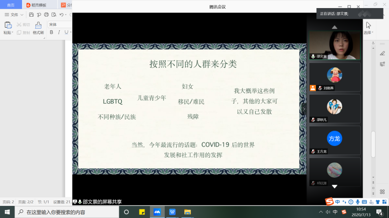 为拓展专业领域知识、增强实务工作能力、培养前沿性思维,我院社会学与心理学系2018级本科生学年实习讲座正式启动。7月13日10:00-12:00,实习讲座第一场在腾讯会议线上平台正式开始,讲座由课程负责教师刘晓燕博士主持,2018级社会工作专业全体同学参加。