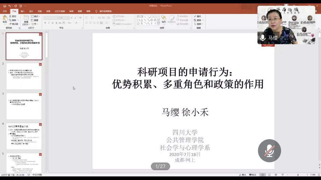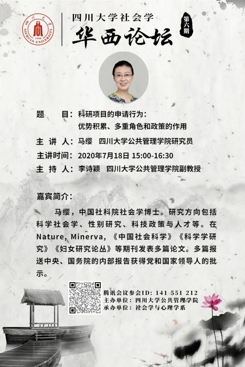 2020年7月18日下午15:00,四川大学社会学华西论坛云系列讲座第六期于线上成功举行。betway西汉姆联官网社会学与心理学系马缨研究员发表了题为“科研项目的申请行为:优势积累、多重角色和政策的作用”的精彩演讲。讲座由社会学与心理学系李诗颖副教授主持,百余名来自我校和省内外兄弟院校的师生参加了讲座。