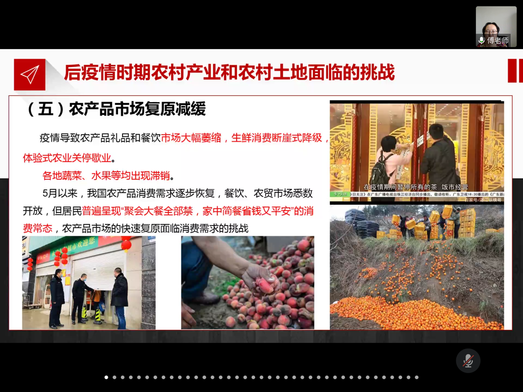 在最后的交流环节,土地资源与房地产管理系的师生就两次疫情对农业农村影响的不同之处、疫情与地摊经济、保种、智慧农业、撂荒现象等方面纷纷提出自己的问题,傅新红老师与在场师生进行了热烈而深入的讨论,同学们都觉得受益匪浅,意犹未尽。