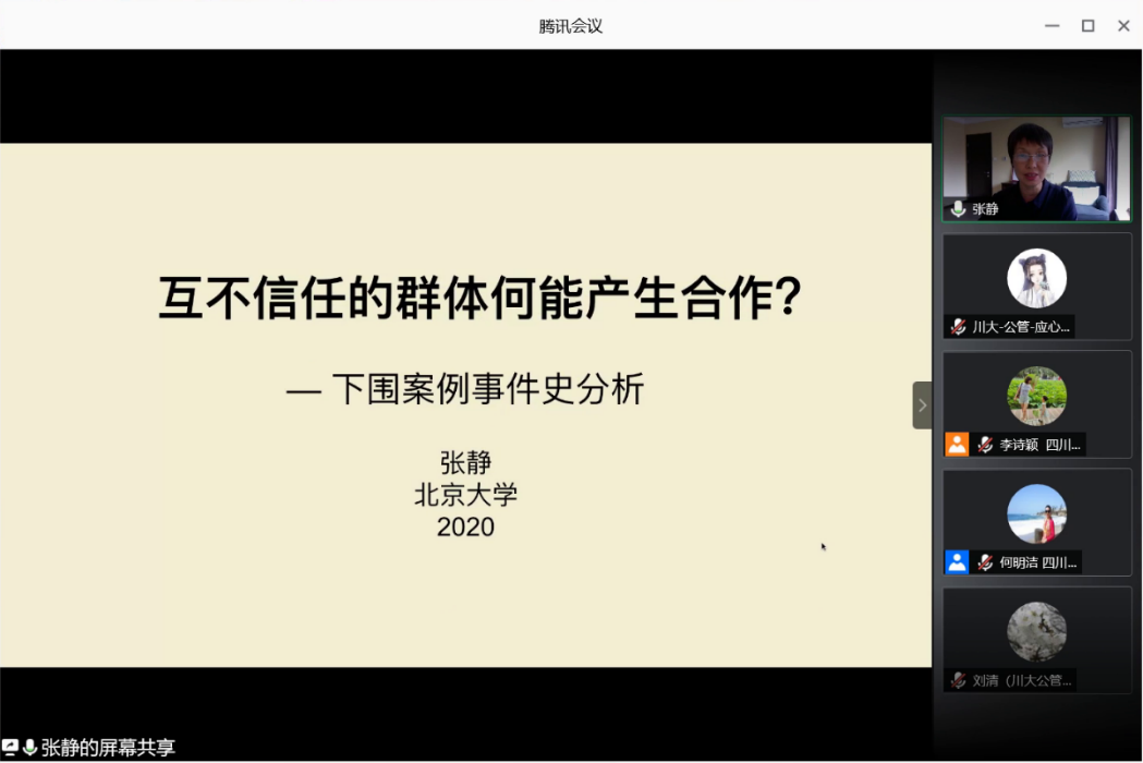 下围案例是互不信任群体之间产生合作的典型案例,对当代中国社会问题的本土实践研究具有重要价值,张静教授对该案例深入浅出的讲解和洞悉本质的理论总结唤起了同学们对本土案例的研究兴趣,加深了大家对中国社会问题的理解,对今后的学术研究极具启发性。这次讲座充分体现了华西社会学研究聚焦社会现实、以解决社会问题为己任的学术精神,在讲座的最后,与会者用热烈的掌声在云端向张静教授表达了诚挚的感谢。