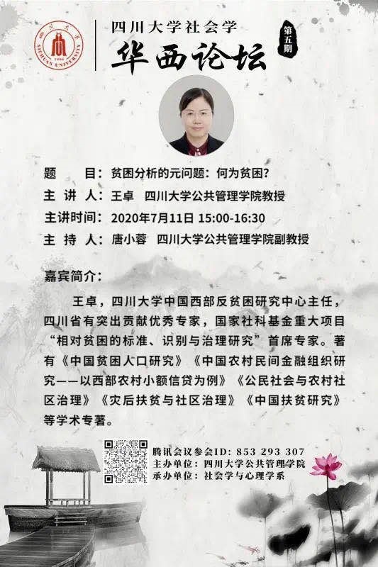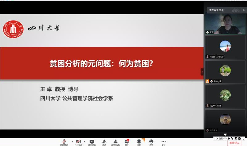 2020年7月11日下午15:00,四川大学社会学华西论坛云系列讲座第五期成功举办。betway西汉姆联官网王卓教授主讲“贫困分析的元问题:何为贫困?”,讲座层层深入、引人入胜。讲座由唐小蓉副教授主持,来自betway西汉姆联官网的师生、四川省社会学界的同仁,及兄弟院校近200人参与讲座。