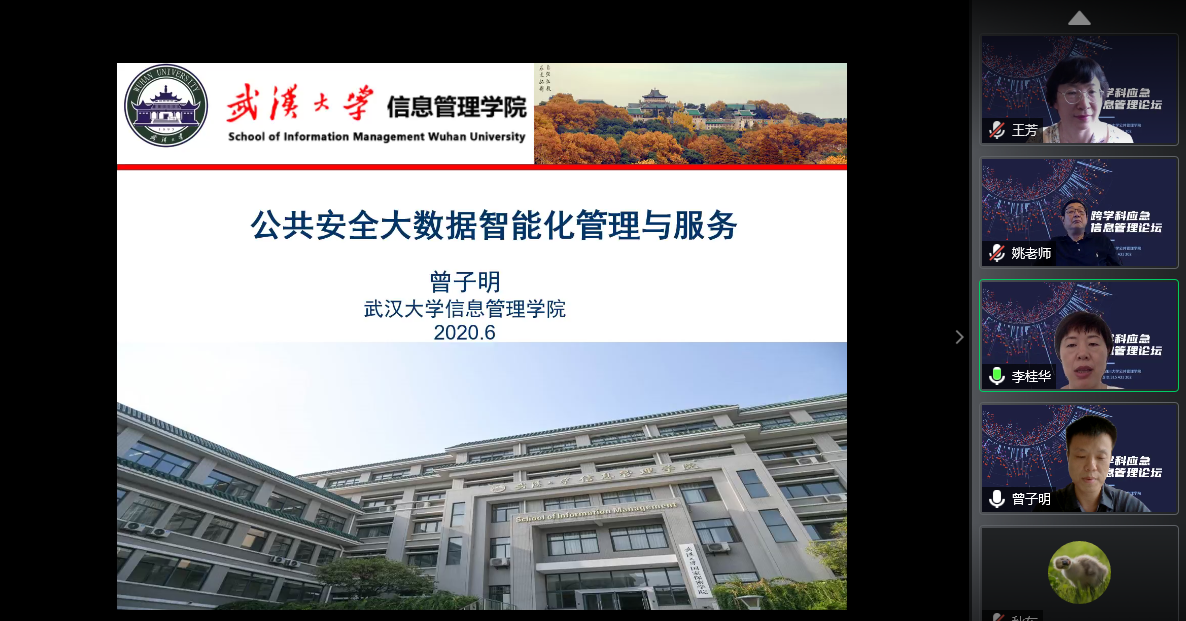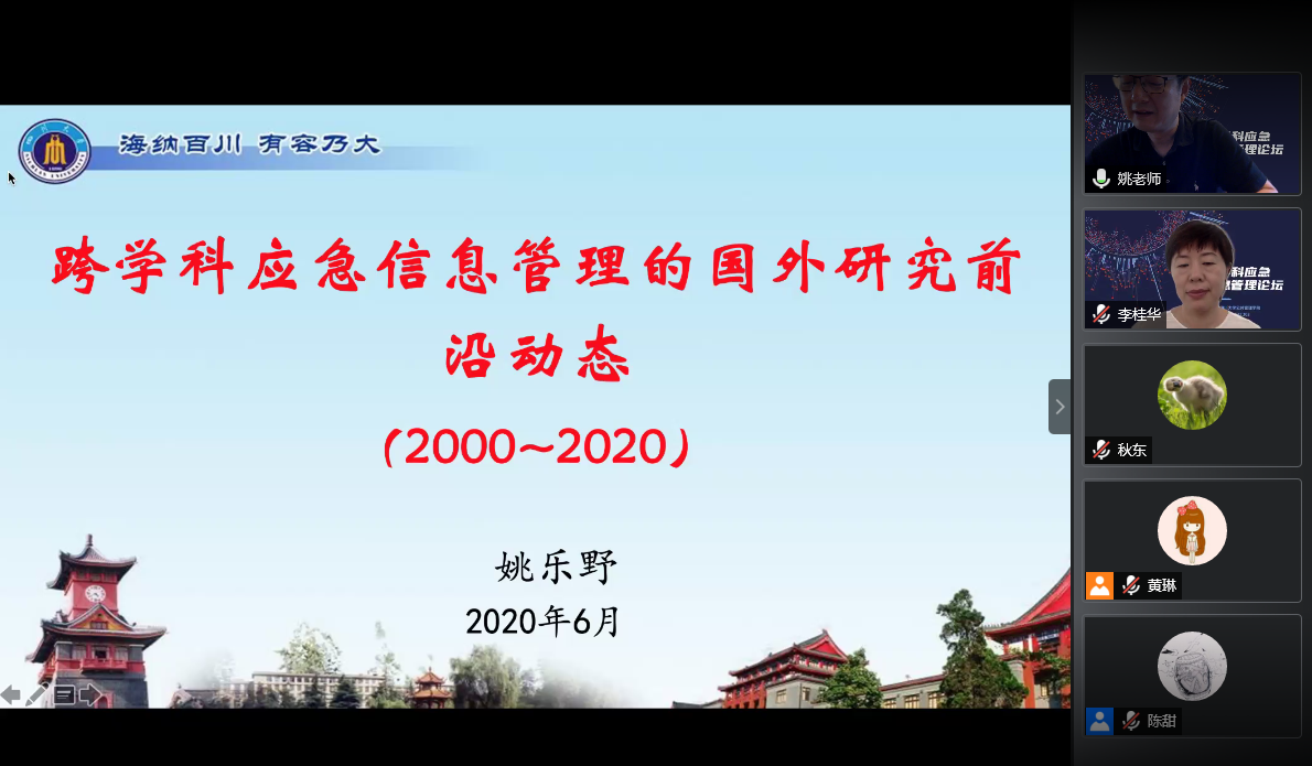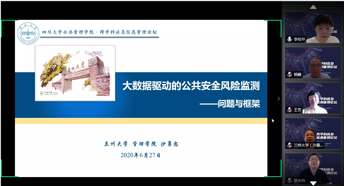 2020年6月27日,由betway西汉姆联官网主办的“跨学科应急信息管理论坛”云端学术会议成功举办。来自兰州大学、清华大学、四川省社会科学院、南开大学、武汉大学、四川大学等国内高校、科研机构的专家学者齐聚云端会议室,从风险监测、法律修订、国际研究动态、本体构建、大数据智能化管理与服务、情报感知、应急建档等方面对应急信息管理问题进行了跨学科、宽领域、多角度的探讨。