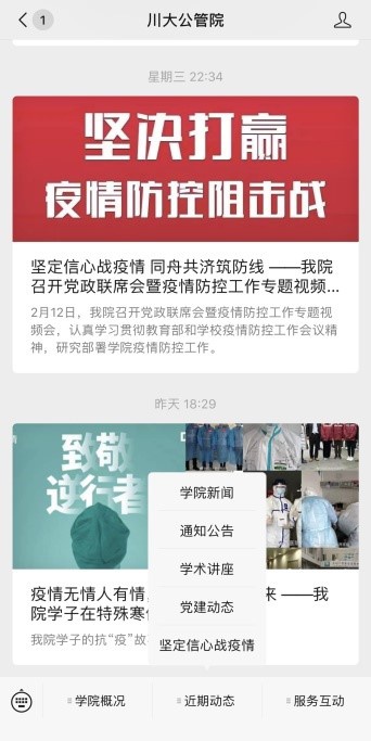 学院党政领导高度重视,第一时间成立了疫情防控工作小组,先后发布《致全院党员及师生员工的一封信》《给川大公管湖北学子的一封信》,并在学院官网、官微开辟防控疫情专栏,将疫情防控各项工作部署传达落实到每位师生。学院党委发布《中共betway西汉姆联官网委员会关于坚决贯彻落实习近平总书记重要指示精神在打赢疫情防控阻击战中积极主动履职有效发挥作用的通知》,号召党支部和党员干部全力以赴做好疫情防控工作,充分发挥党组织的战斗堡垒作用和党员的先锋模范带头作用。
