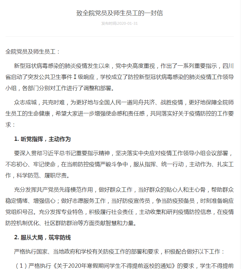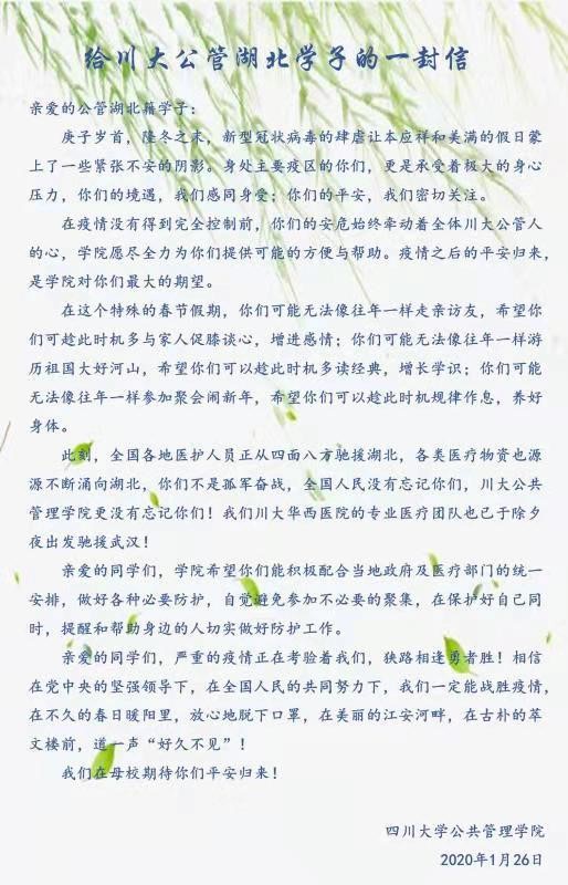 《致全院党员和师生员工的一封信》、《给川大公管湖北学子的一封信》