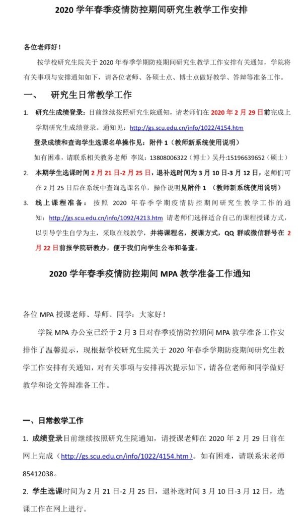 学院党政领导带领各办公室提前规划,认真准备,全力做好疫情防控期间各项工作。学院教务办公室按照教育部、四川省教育厅和研究生院的相关通知,贯彻落实“停课不停教、停课不停学”,制定《2020年春季疫情防控期间教学准备工作方案》,组织任课教师参加在线教学方式培训,组建课程工作qq群,征集线上课程“课代表”,实施湖北学子防疫期间学业关怀计划,努力做到防控期间教学和疫情过后正常教学的有机衔接。学院科研办公室通过线上发布信息等多种方式,扎实组织各类科研项目尤其是疫情防控相关项目的申报工作。学院外事办公室建立了外籍、港澳台侨师生工作群,及时通知相关信息,帮助师生解决实际困难。学生工作办公室向毕业生线上推送华为、人民日报社、军队院校、中建等100余家优质用人单位招聘信息,积极弘扬“宅着也要学”的精神风貌,联合校友企业华图教育助力学生在家备战求职,开展在线学习,保质保量推进毕业生工作。党政办公室加强学院大楼管理、实施公共区域、室内卫生清洁和消洒工作,采购消毒液(片)、洗手液等防疫物资,搭建学院welink视频会议平台,做好各项防控保障工作。
