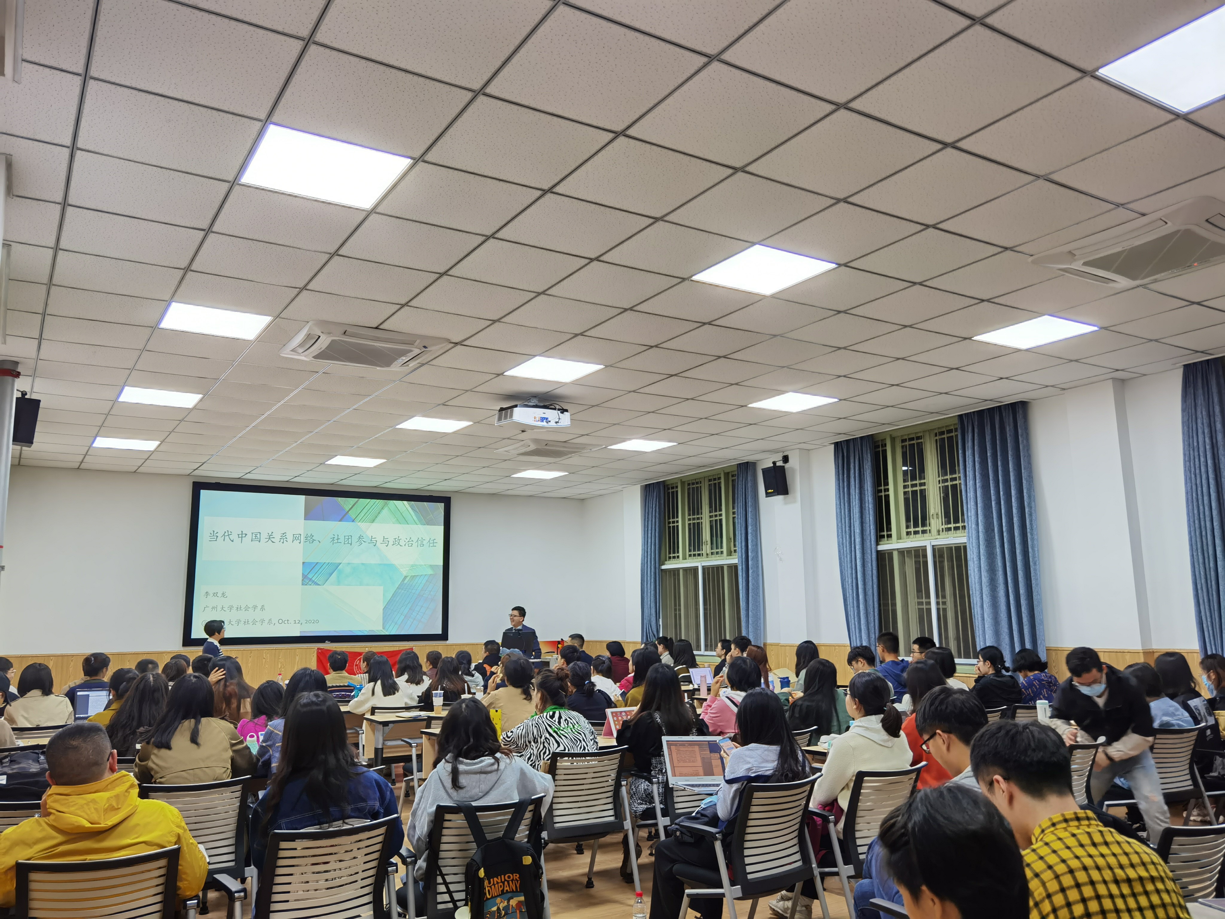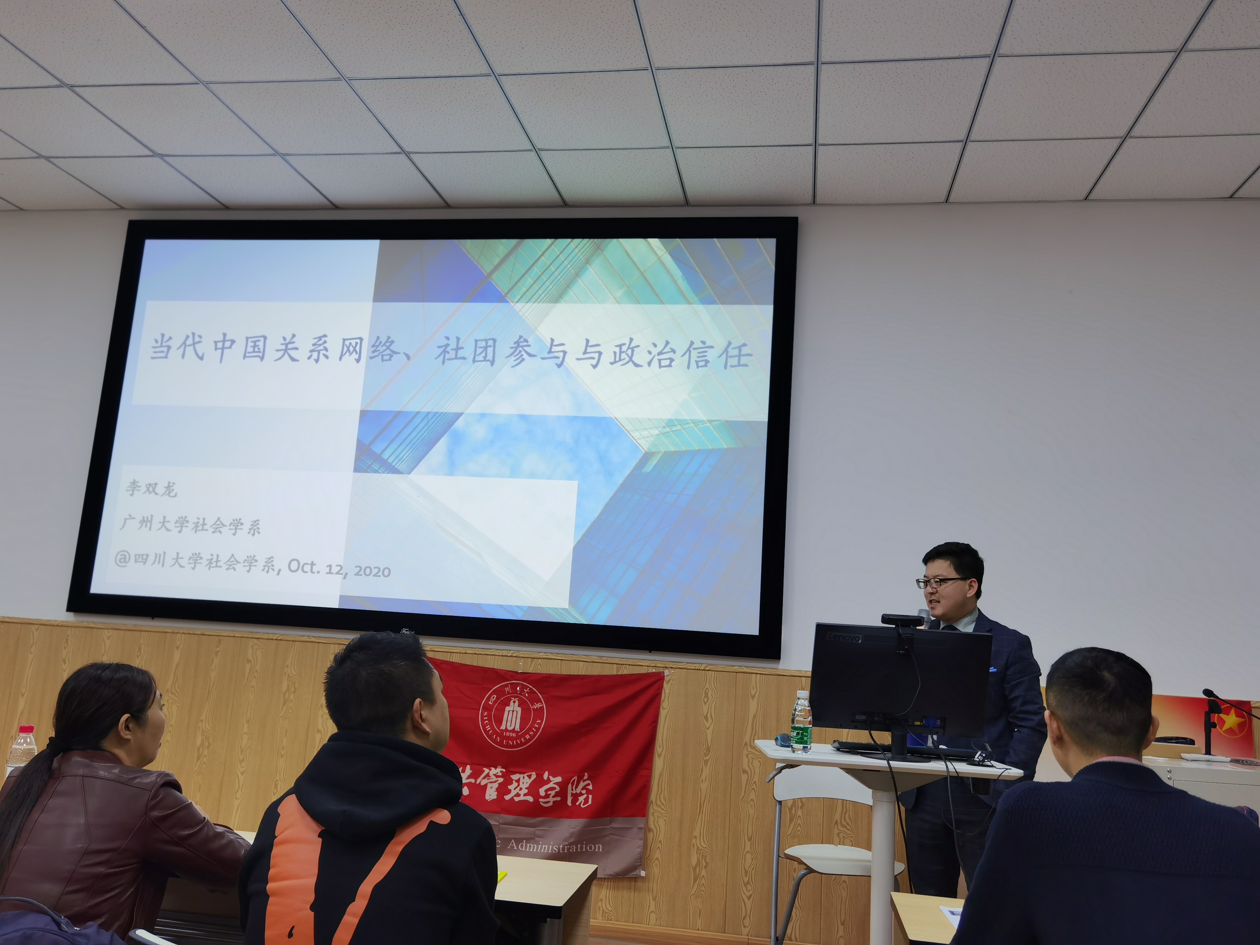 2020年10月12日晚上7点,四川大学社会学·华西论坛系列讲座第八期成功举办。广州大学社会创新研究中心副主任、社会学系李双龙副教授在我院106报告厅开展了主题为“当代中国的关系网络、社团参与和政治信任(Guanxi Networking, Associational Involvement, and Political Trust in Contemporary China)”的精彩讲座。讲座由社会学与心理学系郑莉副教授主持,社会学与心理学系、兄弟院校师生近百人参加了讲座。