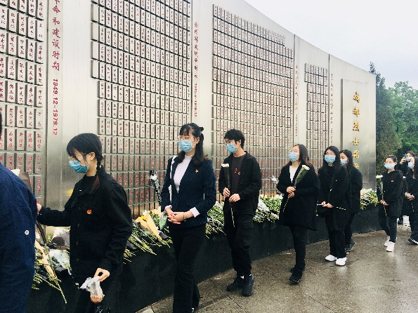 早晨8点45分,我院同学们统一身着黑色服装,佩戴口罩,同华西公卫、化工和物理三院的同学共同乘坐校车前往成都市烈士陵园。到达陵园后,同学们有序排成四列纵队,由工作人员依次为大家分发祭奠革命英烈的鲜花。在陵园内志愿者的统一组织下,同学们迈着庄重的步伐登上了祭奠革命英烈的台阶,先后进行了奏唱国歌、默哀、敬献花篮和鲜花、安静走过革命英烈纪念长廊等仪式。其中,所有党员同志在祭奠仪式结束后,还在革命英烈纪念长廊一旁庄严宣读了入党誓词,重温了入党时的坚定与热血。