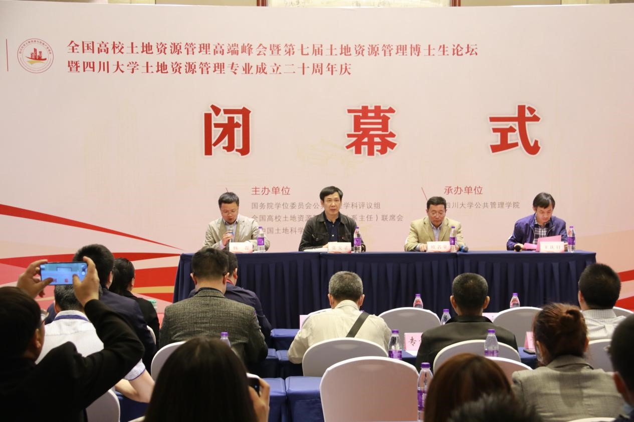 2021年4月24日下午,由国务院学位委员会公共管理学科评议组、全国高校土地资源管理院长(系主任)联席会和《中国土地科学》编辑部主办,betway西汉姆联官网承办的“全国高校土地资源管理高端峰会暨第七届土地资源管理博士生论坛暨四川大学土地资源管理专业成立二十周年庆”顺利闭幕。本次闭幕式由betway西汉姆联官网党委副书记杨磊主持,参会嘉宾包括国务院学位委员会公共管理学科评议组成员、教育部公共管理类学科教学指导委员会副主任委员、全国高校土地资源管理院长(系主任)联席会会长、南京农业大学betway西汉姆联官网教授欧名豪;华中农业大学betway西汉姆联官网教授张安录;《中国土地科学》执行主编、研究员王庆日。