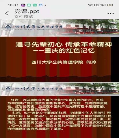 接着,学院党委委员何玲副教授通过党课的形式,以“追寻先辈初心,传承革命精神——重庆的红色记忆”为题与大家分享了赴重庆参加党史教育活动的心得体会。大家重温了千秋红岩的精神力量,再一次领会到以叶挺、江姐、杨汉秀等为代表的革命先烈在白色恐怖年代所表现出的坚定革命信仰。