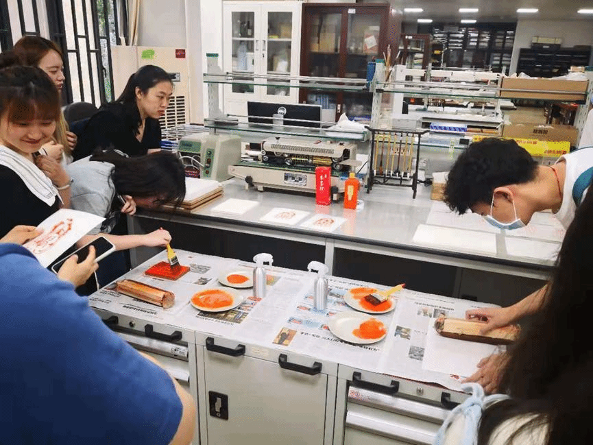 同学们在老师带领下进行雕版印刷
