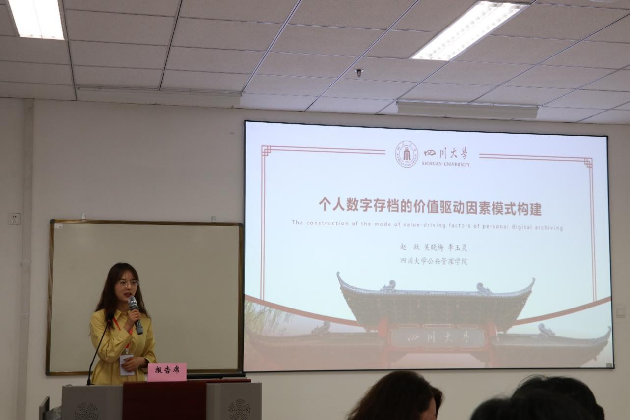 秘书档案学系赵跃副研究员携学生吴晓梅和李玉灵在分会场主题做了“个人数字存档的价值驱动因素模式构建”学术报告,指出数字时代个人数字材料的保存充斥着多类风险,个人层面的数字材料保存问题受到广泛关注。赵跃副研究员率团队利用访谈法和扎根理论,探究个人数字存档行为背后的价值驱动因素,发现了个人数字存档的价值驱动模式。赵跃副研究员在平行研讨会之“青年学者交流”部分,围绕“四川大学档案学专业‘学年课’建设实践”进行了主题发言,并与青年学者就新文科建设背景下的档案学专业教育问题进行了广泛深入的交流和讨论。