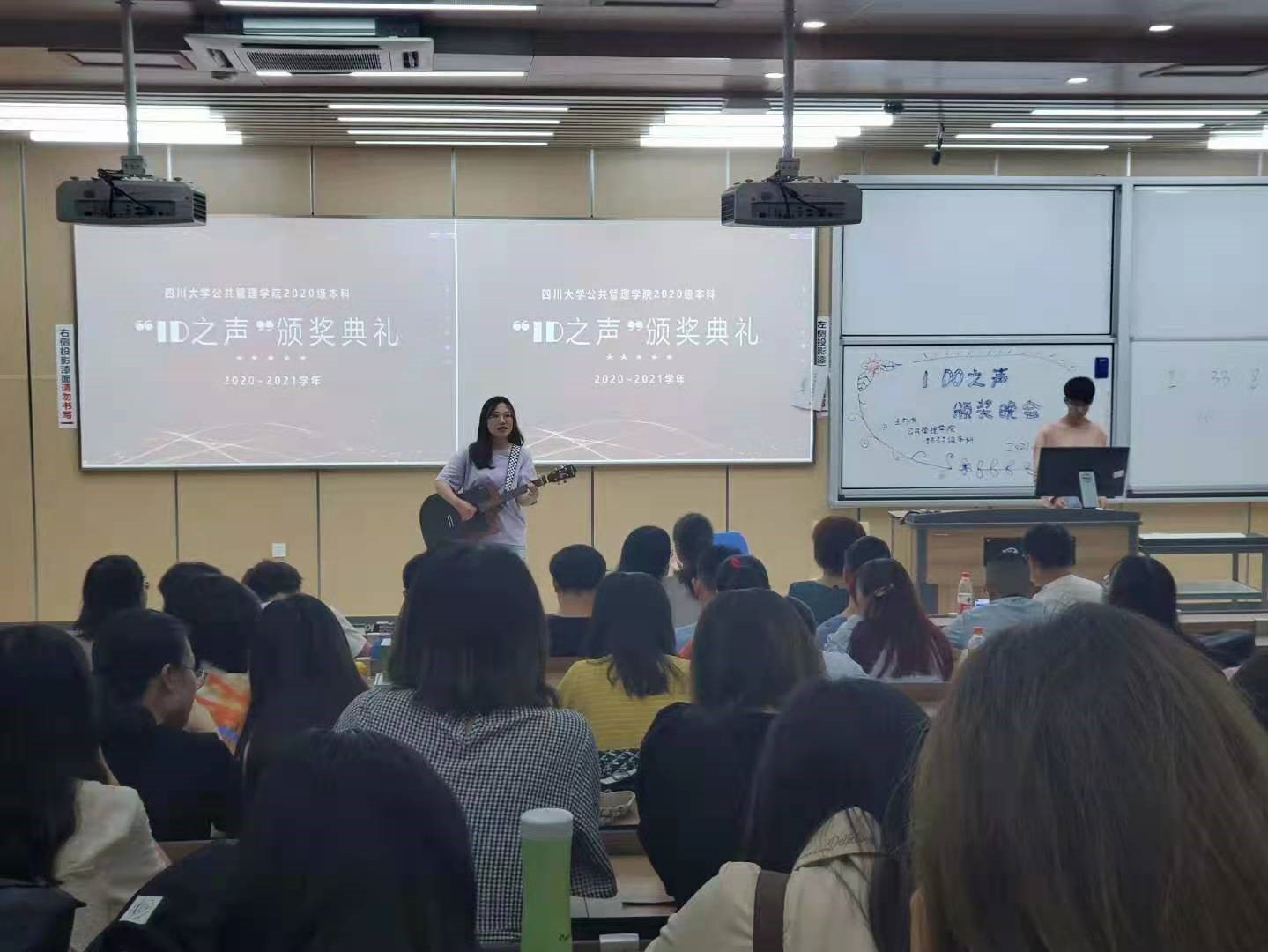 随后,晚会连续进入到第二项和第三项进程:对“I D0社区”学习类和生活类的表彰。“I D0社区”学习类表彰项目主要是对过去一学年,在“I DO社区”一直持续进行的“I DO学习行动”,此次主要设置了“I DO天使”奖、“I DO精灵”奖、“I DO 高数联盟”自助奖、“I DO早鸟”将等奖项,以此鼓励同学们在学习上养成互帮互助,积极向上的良好气氛。随后2020级公共管理大类三班的林秩舟同学为大家带来一段精彩的吉他弹唱,鼓励同学们坚持自己初心和始终。