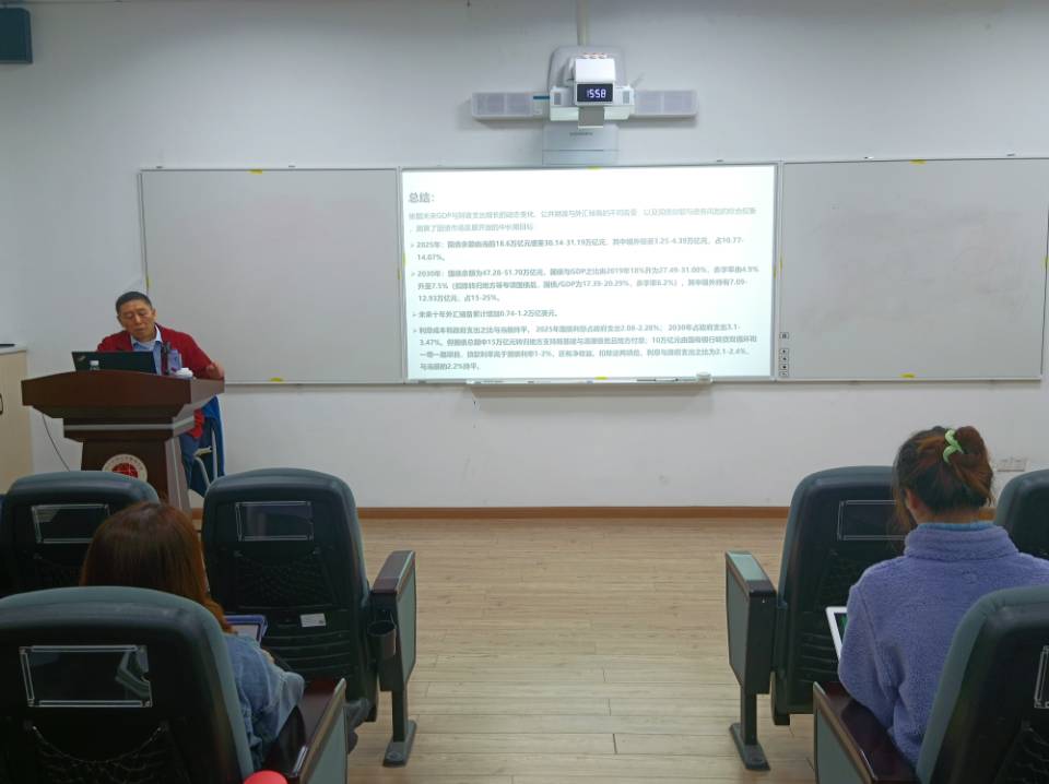 在新冠疫情常态化和美国对华战略挤压的背景下,地缘政治冲突、文化冲突、意识形态冲突、民族主义冲突频发。面对这些问题,世界上的主要国家多采取各自为政的举措,导致全球难以携手合作,国际关系愈发紧张。俞樵教授认为,建设更遵循国际秩序、更开放包容、更高质量发展的开放经济才是破局的理性选择,而进行高水平的金融市场开放则是重中之重。俞樵教授通过几组图表和数据为同学们展示了宏观背景之下国际经济的几大特点:一是疫情后的中美经济增长竞争,美国自1990年后首次GDP增长率超过中国;二是在扩张性货币政策、经济全球化、电子商务发展及人口老龄化的影响下,全球价格水平上涨;三是疫情的流行使得政府债务达到二战以来的最高峰,国债总量增加而利率下降;四是全球市场现金充裕,全球投资的调整有待考量。