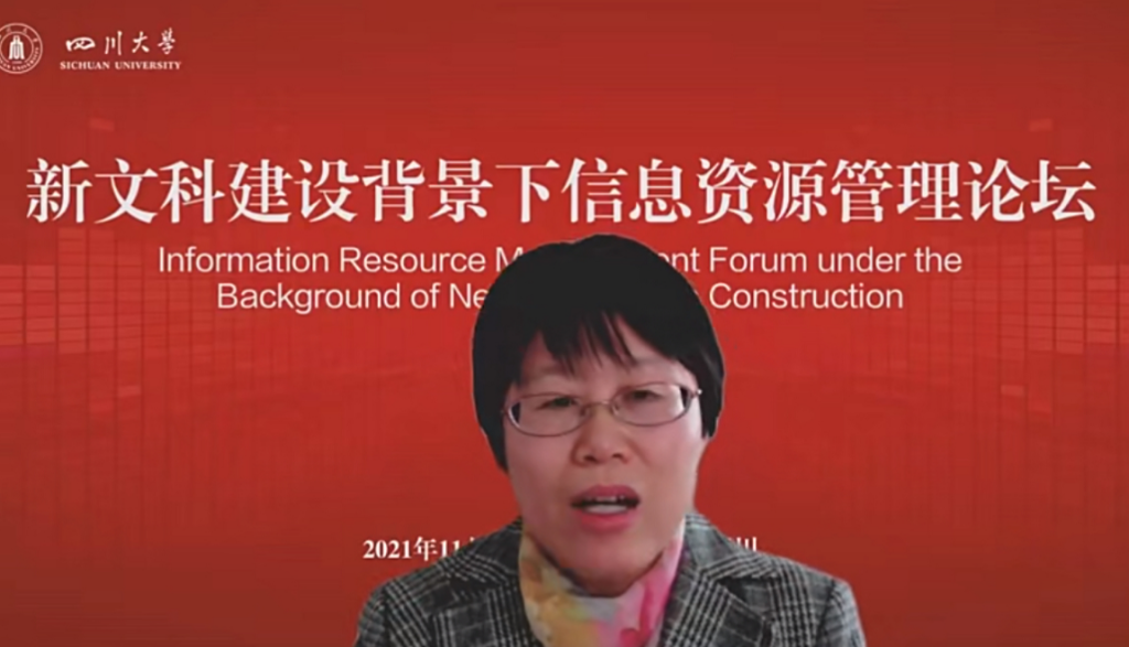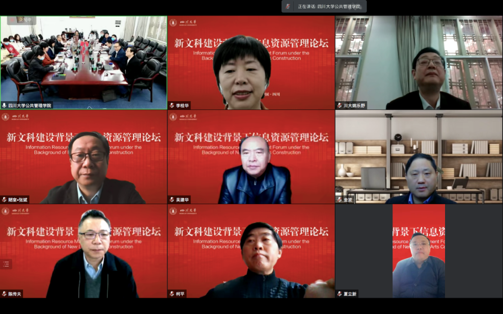 2021年11月28日上午,“新文科建设背景下信息资源管理论坛”在四川大学望江校区举行。会议采取线上线下相结合的方式,主会场设在betway西汉姆联官网311会议室。来自全国的教育部图书馆学教学指导委员会和档案学教学指导委员会教育专家,四川大学副校长姚乐野教授,四川大学图书馆馆长党跃武教授,以及信息资源管理专业教师赵媛、罗骏、纪希禹、马蕾、史坤蓉、李桂华、袁莉、杨峰、范炜、吕鹏辉、周良、杨海娟老师等30余位师生出席本次会议,云端相聚,共议新文科建设背景下信息资源管理发展问题。