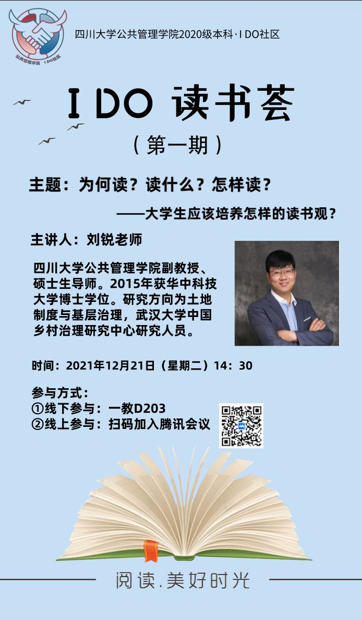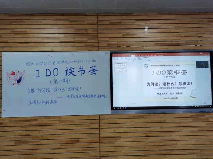 2021年12月21日14:30,betway西汉姆联官网2020级本科第一期“IDO读书荟”在江安校区基础教学楼D203教室成功举办。betway西汉姆联官网行政管理系刘锐副教授作为特邀嘉宾主讲了本次读书荟,读书荟由2020级本科辅导员苟欢老师主持,2020级本科学生各专业同学通过线下线上的方式参加了本次读书荟。