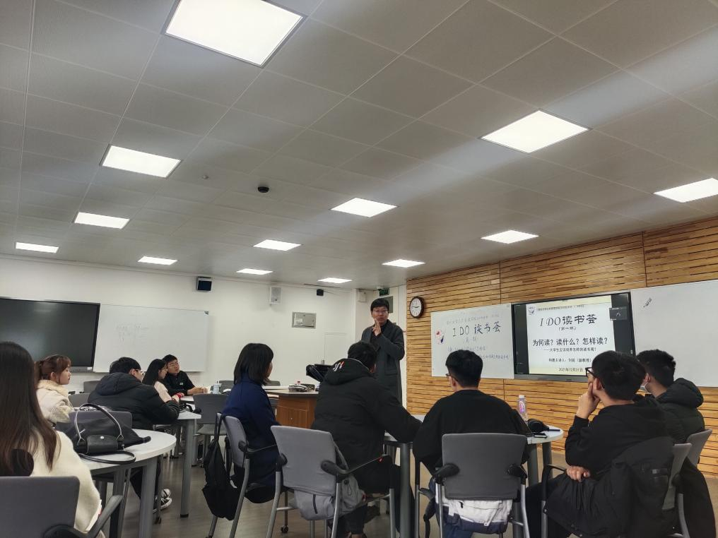 “I DO读书荟”伊始,苟欢老师首先介绍了IDO读书荟成立的意义、目的以及之后的运行模式,随后,第一期“I DO读书荟”采取特邀嘉宾主题分享-同学自主提问的形式正式进行。刘锐老师紧密结合大学生读书的功用、内容和方法,向同学们分享了“大学生应该拥有怎样的读书观”这一核心问题。
