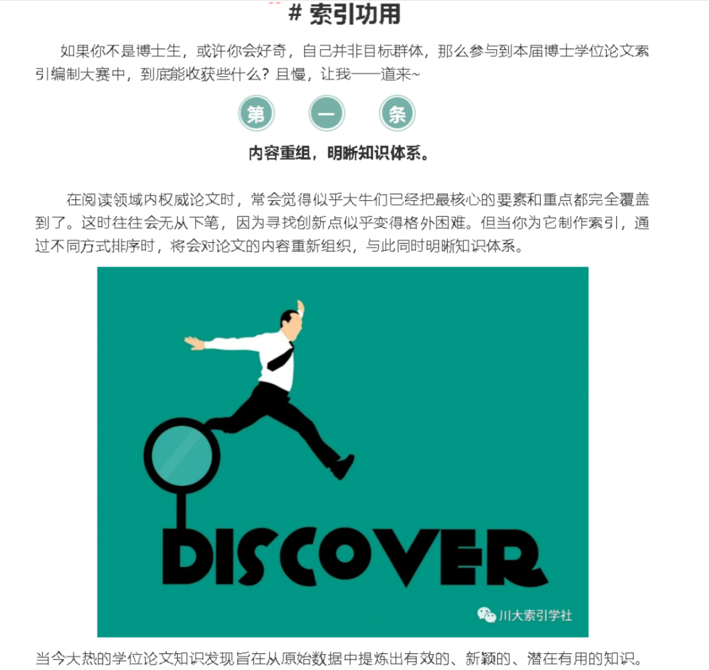 前期宣传阶段,我院索引学社师生团队与复旦索引学社进行对接,结合川大实际情况,收集有意向参加比赛学生的意见,提供了比赛反馈建议。社长韩颐堃、副社长鄢世民参考往届大赛指引,制作了一期比赛内容微信推送:整合了索引编制的文字基础规范和往届比赛网络平台讲座回放,以供参赛者学习取用;明确了推广学位论文索引的背景和意义,罗列了川大同学获取学位论文的途径;讲解了索引的主要功用,推广了索引文化。