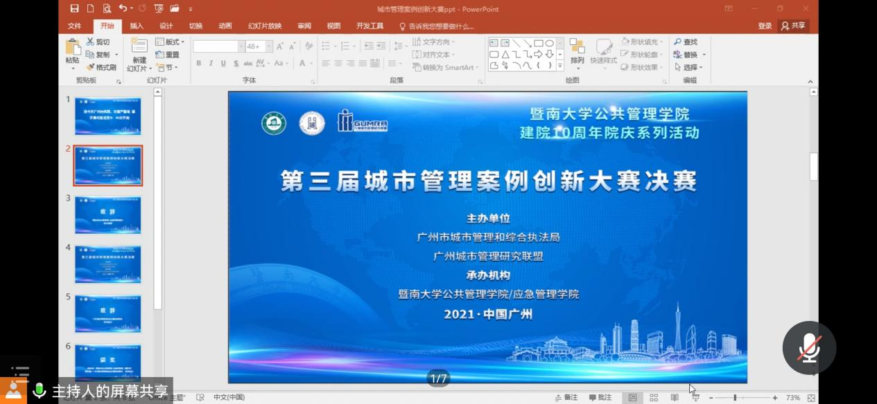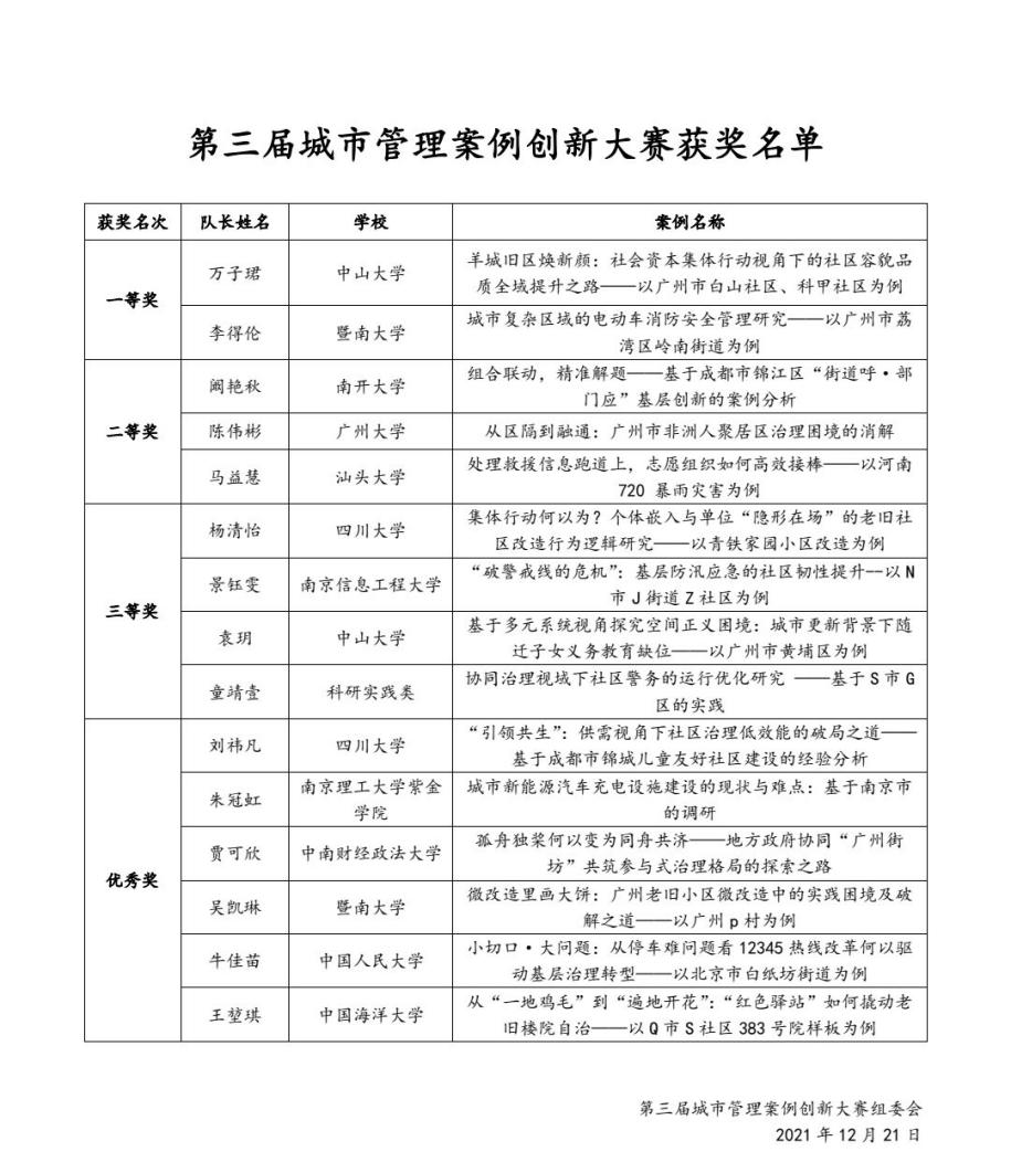 2021年12月21日上午,由广州市城市管理和综合执法局、广州城市管理研究联盟主办,暨南大学betway西汉姆联官网/应急管理学院承办的“第三届城市管理案例创新大赛”决赛通过云端平台正式举办。我院参赛队伍经初赛决赛激烈比拼后,其中两支队伍分别获得大赛三等奖与大赛优秀奖。