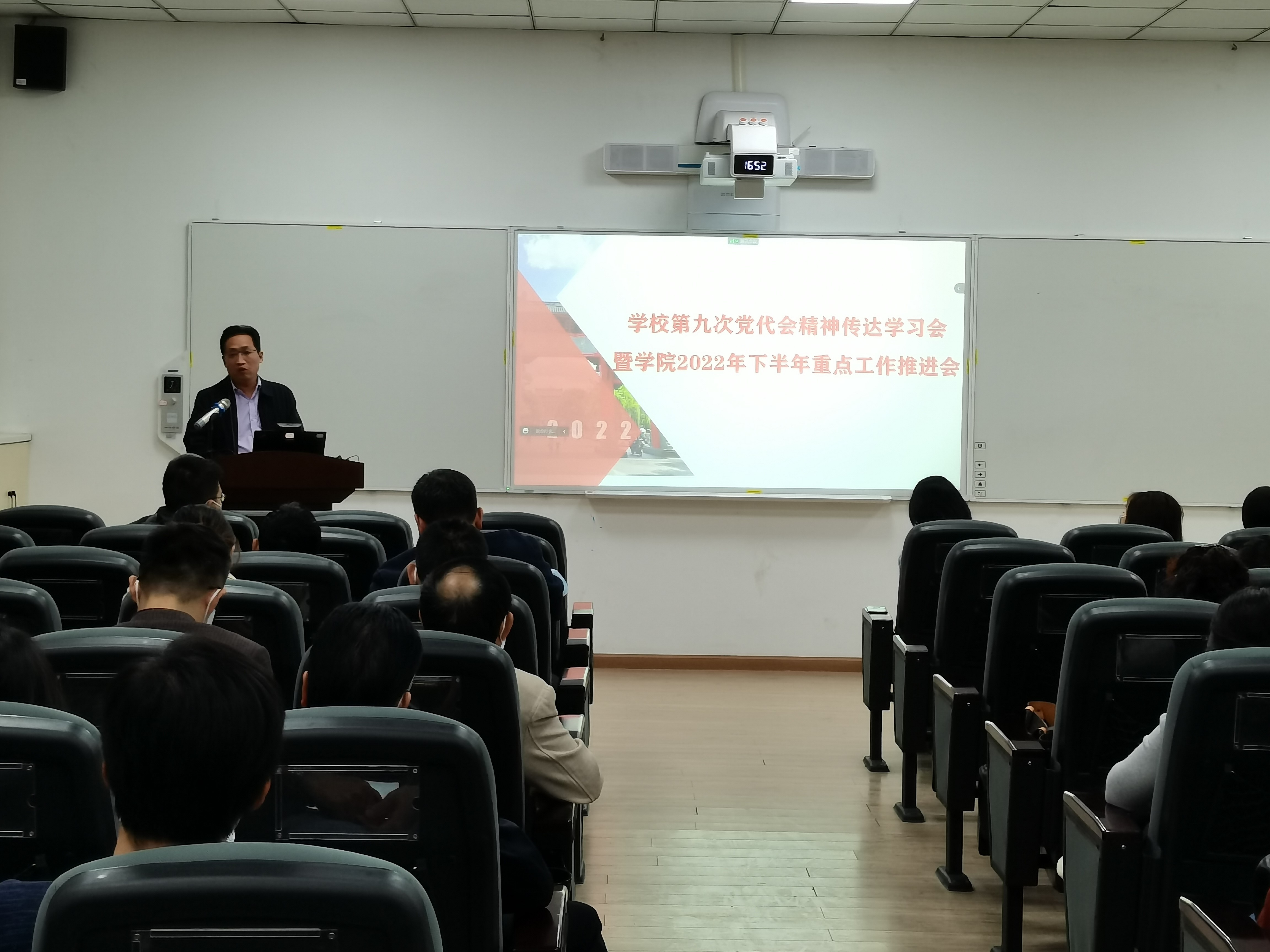 2022年10月9日下午,betway西汉姆联官网在萃文楼105报告厅召开学校第九次党代会精神传达学习会暨学院2022年下半年重点工作推进会。会议由学院党委书记韩杰主持,学院全体班子成员,“两委”委员、系主任、支部书记、科级干部,全体教职工及学生代表参加会议。