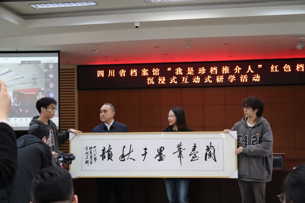 交流会的最后,档案班团支部以全体同学的名义赠送档案馆一幅书法作品——“兰台笔墨千秋韵”,“兰台”是档案管理机构的旧称,以表达对档案工作者的敬意和对四川省档案馆对本次活动支持的谢意。四川省档案馆也给betway西汉姆联官网教工和互动问答环节回答正确的同学赠送了相应的文创产品。
