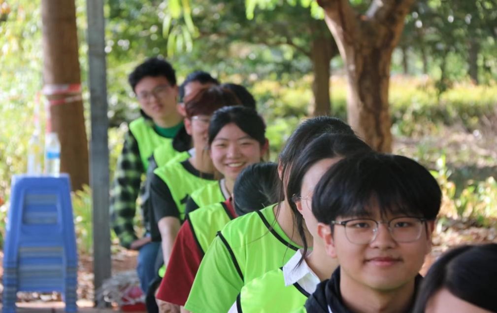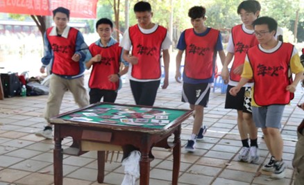 中午同学们集合乘坐大巴前往活动基地。在素质拓展教练带领下,同学们通过“拳王争霸赛”进行活动破冰。同学们通过随机猜拳的方式决定胜负,败方应跟随胜方队伍继续进行随机猜拳,由此决出一位“拳王”,破冰热身活动到此结束。