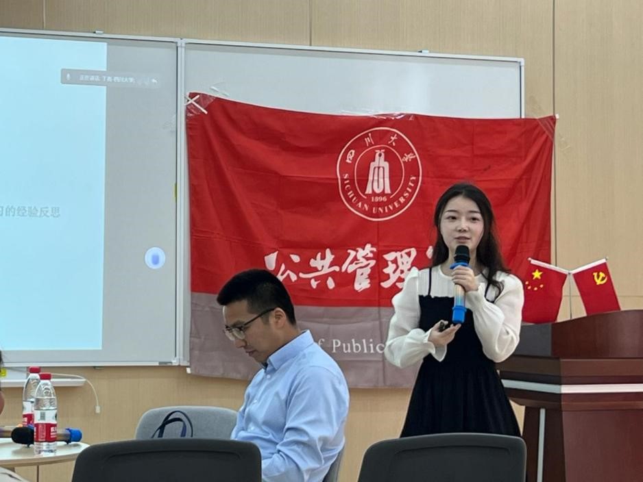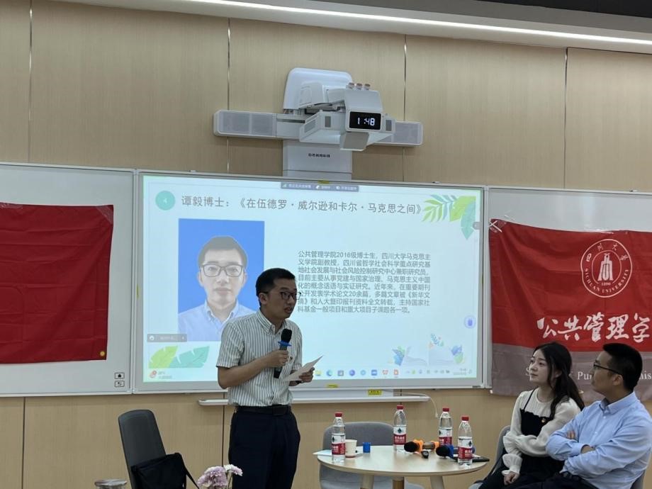 接着,我院2016级博士生、四川大学马克思主义学院副教授谭毅以《在伍德罗·威尔逊与卡尔·马克思之间》为主题,向同学们介绍了跨学科研究的经验与思考。他分别从学科属性、研究议题、话语指向与工具方法等角度解析了马克思主义研究与公共管理研究的分界线与耦合点,分享了他在做跨界研究中的心路历程。