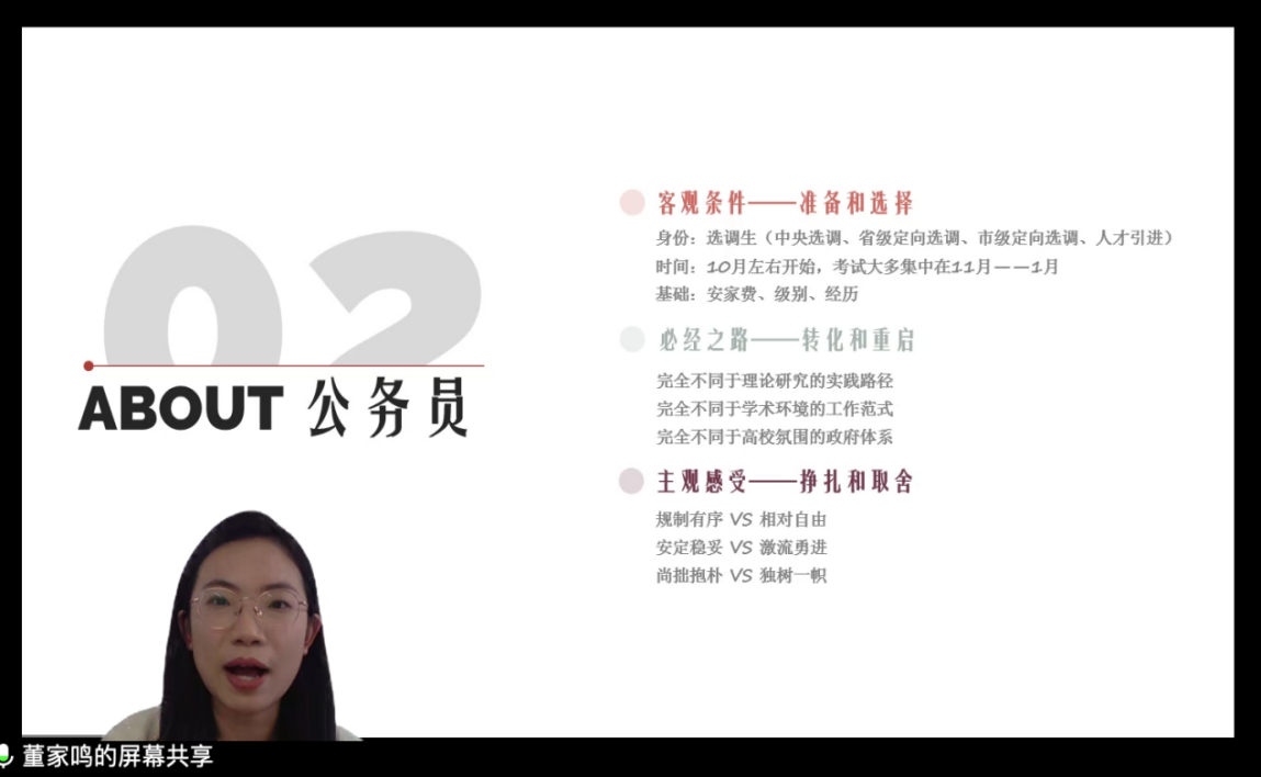 然后,我院2018级博士生、内蒙古自治区党委办公厅党政干部董家鸣以《博士生的无限可能》为题分享了择业与发展心得。她从操作性层面为同学们解答了“如何清晰认识自我”“公务员与高校教职有何差异性”“如何实现人生阶段的重启与转化”等问题,鼓励大家从多种可能性中锚定真正适合自己的人生路径。
