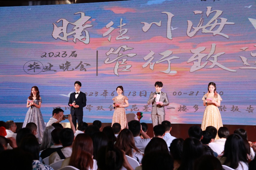 6月18日晚7点,betway西汉姆联官网2023届学生毕业晚会在四川大学双创示范基地一楼多功能演播厅成功举办。学院领导班子、各系教师代表、党政办工作人员、学工组老师参加了晚会。晚会由我院2023届毕业生策划筹办、联袂演出,逾500位师生、家属亲临现场。