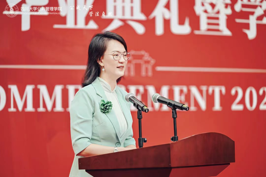 校友代表、四川省委外事办公室中日会馆副馆长、2016届MPA毕业生张晓琴勉励各位学弟学妹,生逢伟大的时代,要心中有明灯;珍惜每一次提升自己的机会;走大路走正路,坚守底线。同时呼吁学弟学妹,要自信、要进取、要开放;要讲好中国故事、展示中华文华、写好四川篇章。
