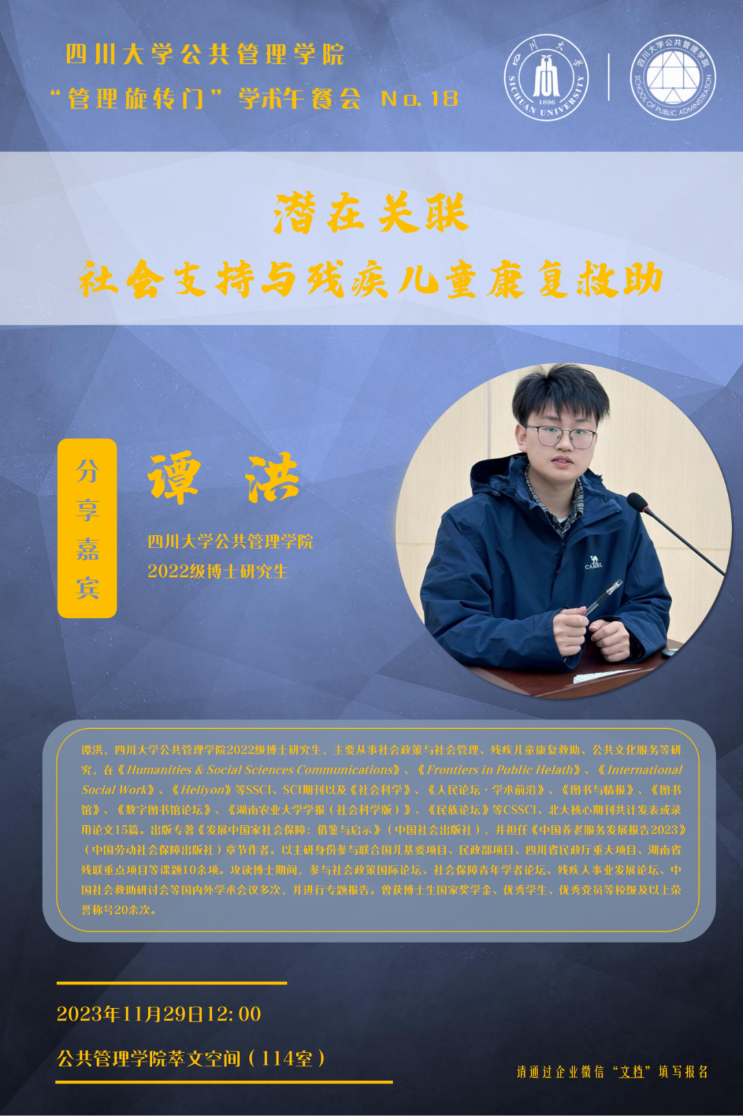 11月29日,betway西汉姆联官网在学院萃文空间成功开展第十八期“管理旋转门”学术沙龙活动。本期学术沙龙特邀本学院2022级博士研究生谭洪分享“潜在关联:社会支持与残疾儿童康复救助”,学院部分学科老师,博士及硕士研究生积极参加了此次交流。本期学术沙龙由劳动与社会保障系田益豪副研究员担任学术主持。