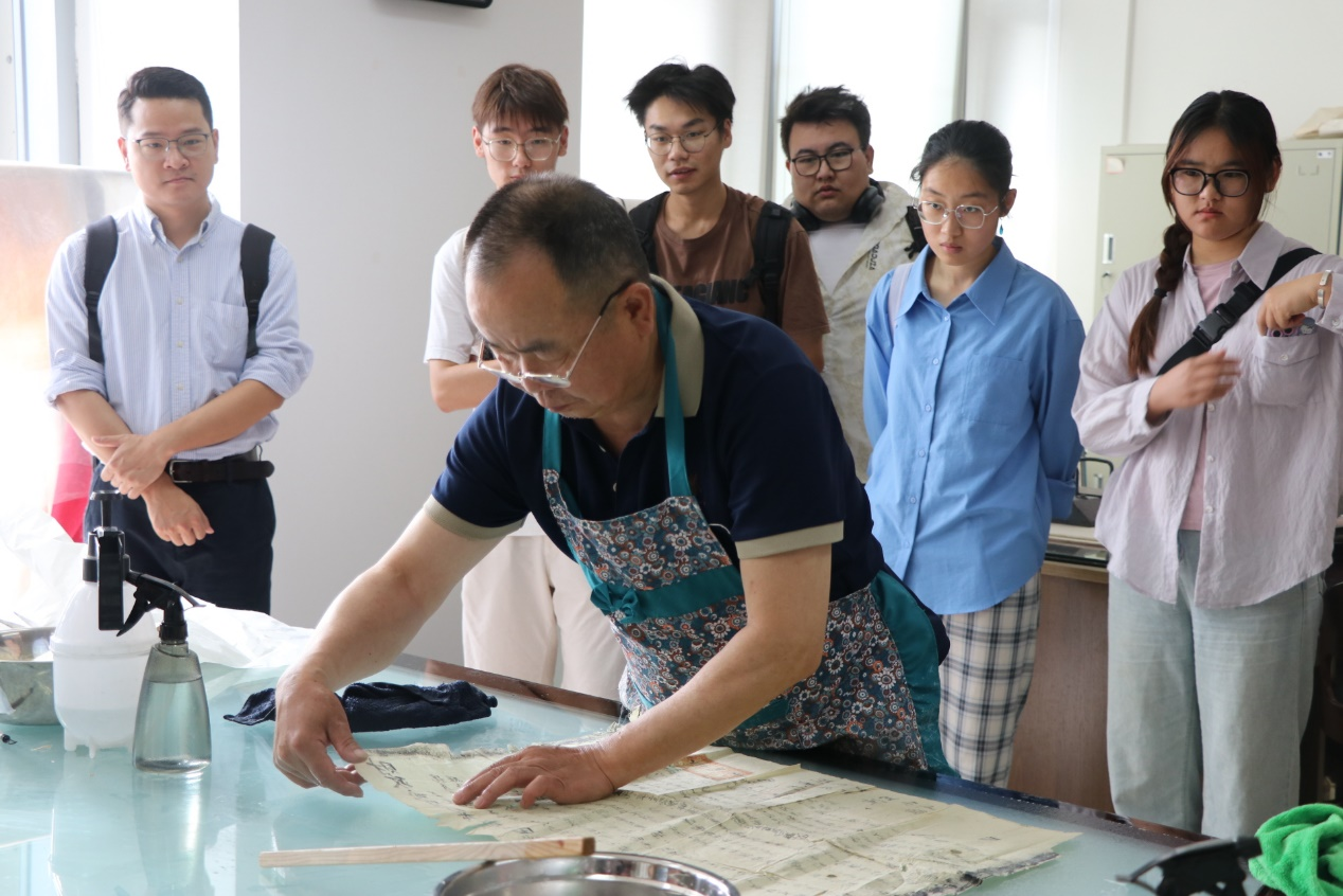 5月23日上午,betway西汉姆联官网秘书档案学系师生前往成都市档案馆开展实践教学活动。本次活动由赵跃老师和杨千老师带队,成都市档案馆档案保护科研处王芳老师、张士兵老师、卢志刚老师、李焕老师为同学们详细讲解了档案修裱、档案仿真复制的基本流程、设备工具、注意事项等,并一一展示了档案修裱的几种技法,同学们积极提问,深化了对于课程理论知识的理解,熟悉了实际操作的方法。