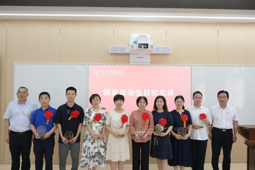 学院党委为党龄整十倍的党员颁发“政治生日”纪念牌,激励全体党员师生牢记党员身份,增强党员意识。