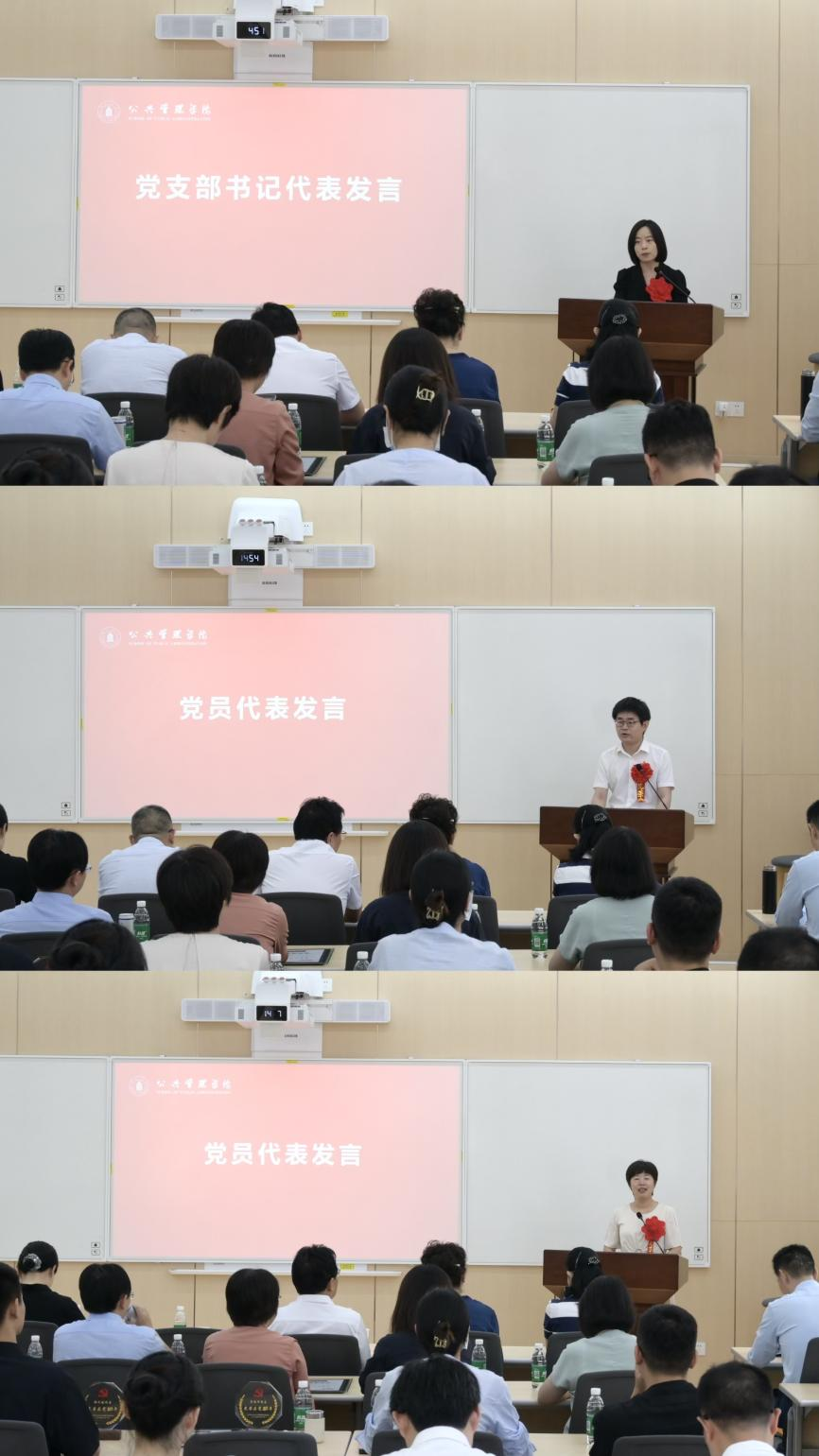 学院先进党支部代表、行政管理系支部书记李晓梅,优秀共产党员代表、博士生第一支部丁亮和党龄整十年党员同志代表、信息资源管理系支部李桂华分别发言,分享所思所想所悟。