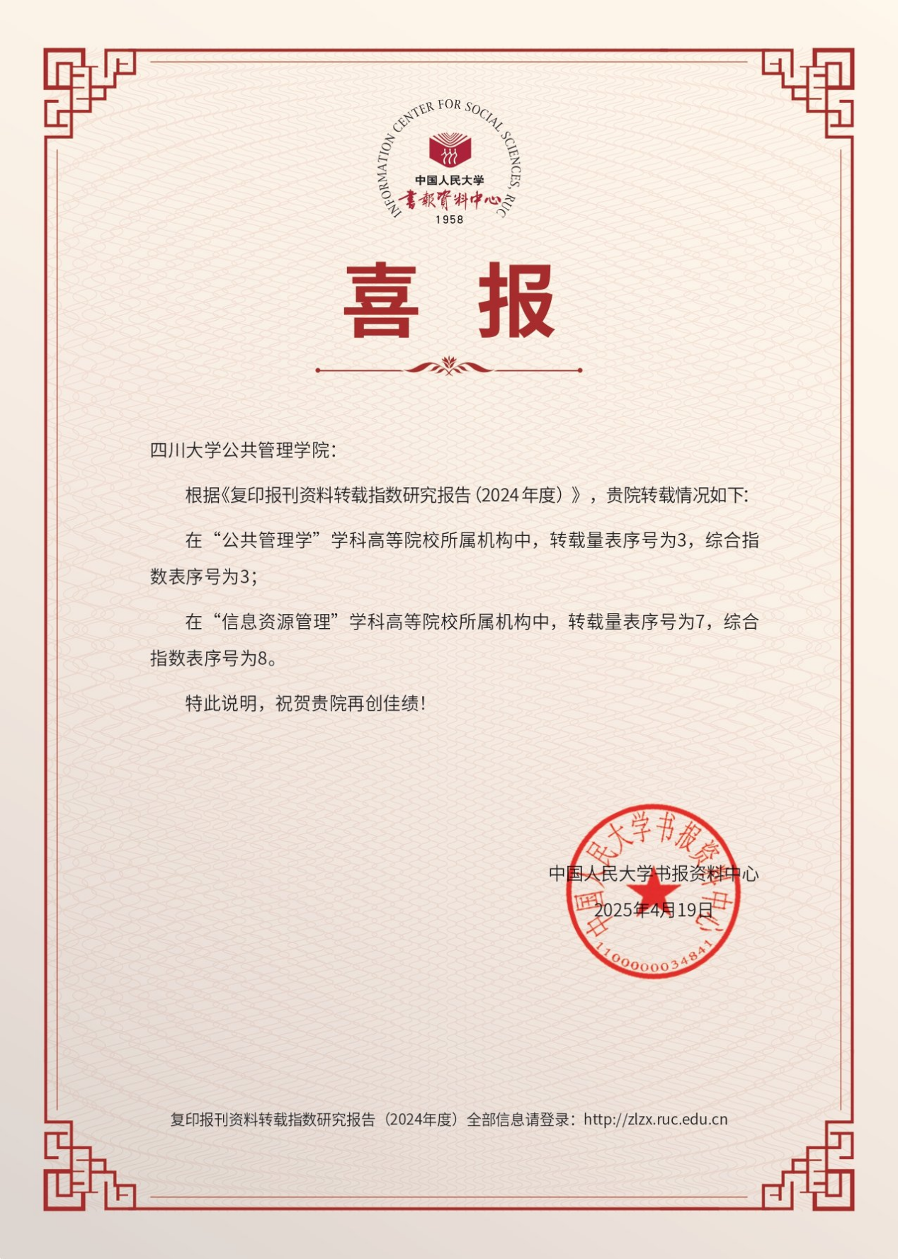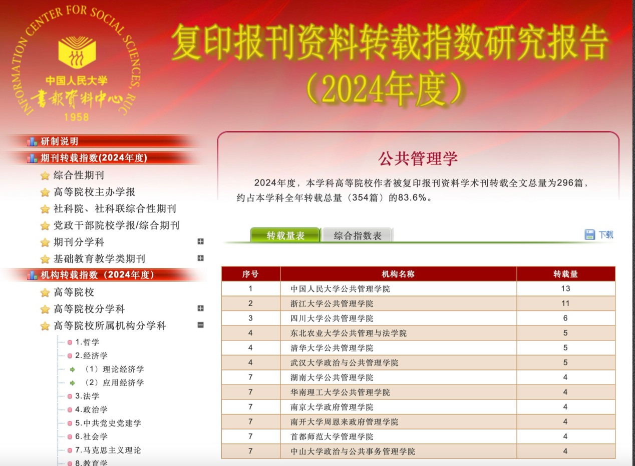 近日,中国人民大学书报资料中心发布了《复印报刊资料转载指数研究报告(2024年度)》。在“公共管理学”学科高校所属机构排名中,betway西汉姆联官网转载量位列全国第3,综合指数位列第3;在“信息资源管理”学科高校所属机构排名中,betway西汉姆联官网转载量位列全国第7,综合指数位列第8。本次入选展现了学院在公共管理学、信息资源管理两大领域的强劲学术影响力与持续创新能力。