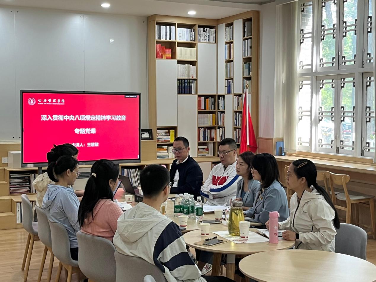 王慧敏结合党中央《关于在全党开展深入贯彻中央八项规定精神学习教育的通知》精神、学校相关工作要求、学院工作特点以及个人学习体会,阐释深入贯彻中央八项规定精神学习教育的重要意义和实践理路。她指出,要贯彻坚持“以人民为中心”的根本立场,勇担历史使命,以更高要求打通服务师生“最后一公里”;深刻理解“秩序”内涵,推动作风建设,主动纠治官僚主义、形式主义在基层的种种表现;践行“整体治理”理念,营造团结奋进的工作氛围,提升服务管理效能;关注个人职业生涯发展,持续提升能力素养,将“小我”成长融入校院发展大局。