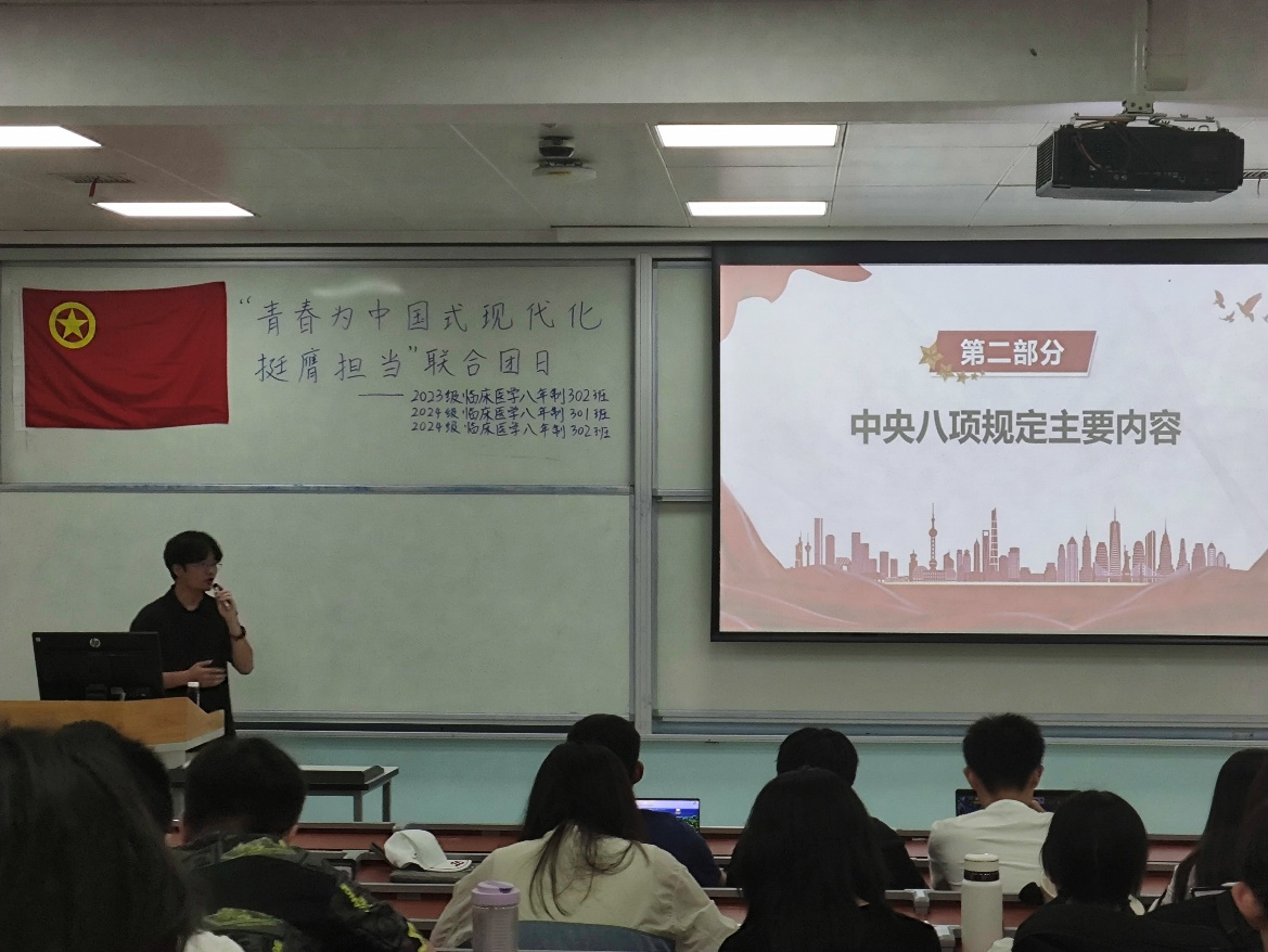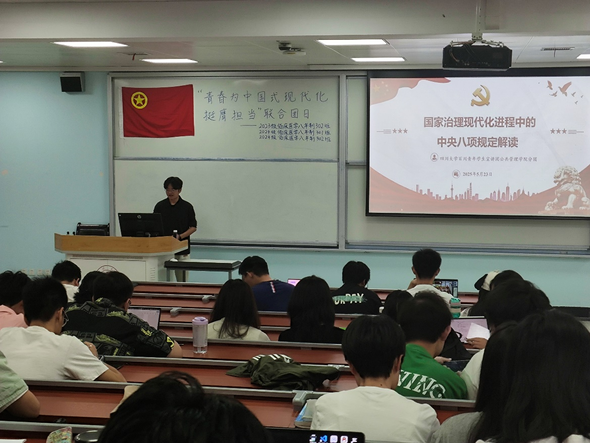 为深入学习贯彻中央八项规定精神,搭建理论学习与实践认知的贯通平台,2025年5月23日,四川大学百川青年学生宣讲团betway西汉姆联官网分团走进四川大学华西临床医学院本科团支部,开展“国家治理现代化进程中的中央八项规定解读”主题宣讲活动,宣讲团成员刘伟同志担任主讲。