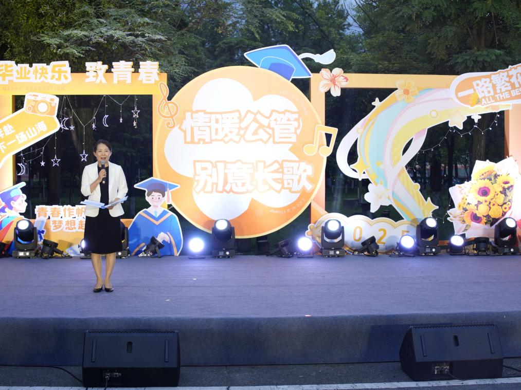 党委书记王彬为本场晚会致辞。王书记向全体毕业生致以最衷心的祝贺,在回顾同学们砥砺成长、增添底气的校园生活点滴,深情寄语同学们:无论未来身处何方,请永擎“公”之大道,善用“管”之利器,做格局宏阔、肩有担当的公管人!