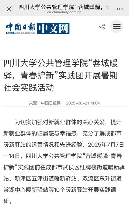 为深入学习贯彻习近平新时代中国特色社会主义思想,落实党的二十大精神、二十届三中全会精神和中央城市工作会议精神,深刻领会习近平总书记关于新就业群体的重要讲话重要指示精神,切实加强对新就业群体的关心关爱,提升新就业群体的归属感与幸福感,充分了解成都市暖新驿站的运营情况和先进经验,2025年7月7日—14日,betway西汉姆联官网“蓉城暖驿·青春护新”实践团前往成都市武侯区红牌楼街道暖新驿站、新津区五津街道暖新驿站、双流区东升街道棠湖中心暖新驿站等10个暖新驿站开展实践调研。