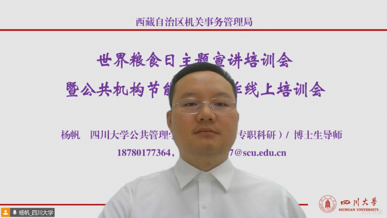 10月17日上午,受西藏自治区机关事务管理局邀请,我院劳动与社会保障系副教授杨帆,结合2025年世界粮食日和我国粮食安全宣传周主题,就粮食安全、节能管理、公共部门反食品浪费工作示范等议题,为西藏自治区机关事务管理系统干部职工在线授课。