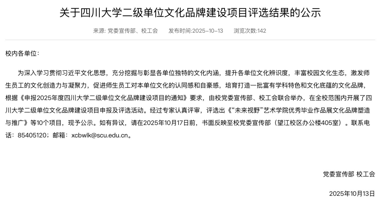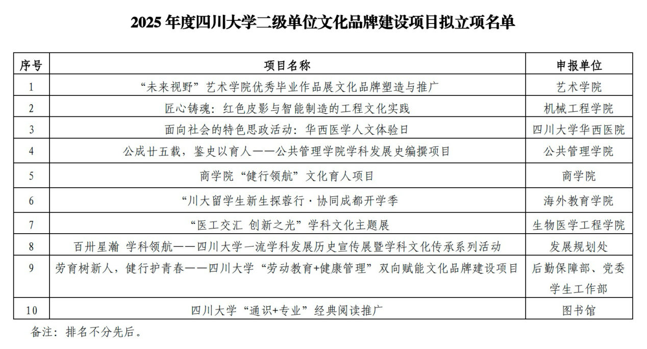 近日,四川大学党委宣传部、校工会发布2025年度四川大学二级单位文化品牌建设项目立项结果,经全校范围的申报、评选及专家评审,共立项10个项目,我院申报的“公成廿五载,鉴史以育人——betway西汉姆联官网学科发展史编撰项目”成功获批立项。该项目旨在通过梳理学院相关学科的发展历史,展现学院与学校共同成长历程中的办学成就与办学特色,挖掘、传承与弘扬公管精神与学科底蕴,增强师生荣誉感、归属感,献礼130周年校庆与25年院庆。学院还立项了党建特色项目“以史育人:学院公共管理学科发展史编撰项目”,也旨在支持学院学科发展史编撰工作。