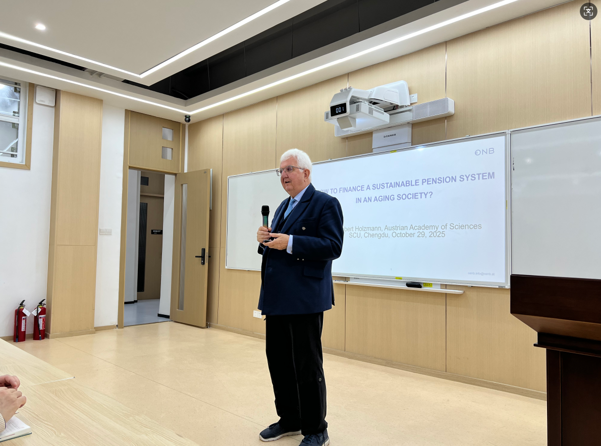 2025年10月29日上午,受劳动与社会保障系邀请,奥地利科学院院士、前奥地利央行行长、原世界银行社会保护部部长罗伯特·霍尔兹曼教授到访我院开展学术讲座。院长夏志强教授代表学院对霍尔兹曼教授的到访表示了诚挚欢迎。劳动与社会保障系教师及硕博士研究生参加了此次讲座。讲座由劳动与社会保障系蒲晓红教授主持。
