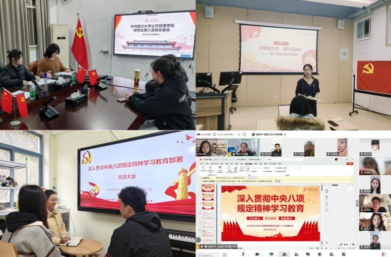 各学生党支部积极组织学生党员深入学习中央八项规定精神的相关内容,要求各党小组认真学习《习近平关于加强党的作风建设论述摘编》,强调学生党员做好《中国共产党纪律处分条例》学习和专业学习的有机衔接,加强警示教育,做到以案示警、防微杜渐。并重点围绕“如何涵养优良研究生学风”展开热烈讨论。