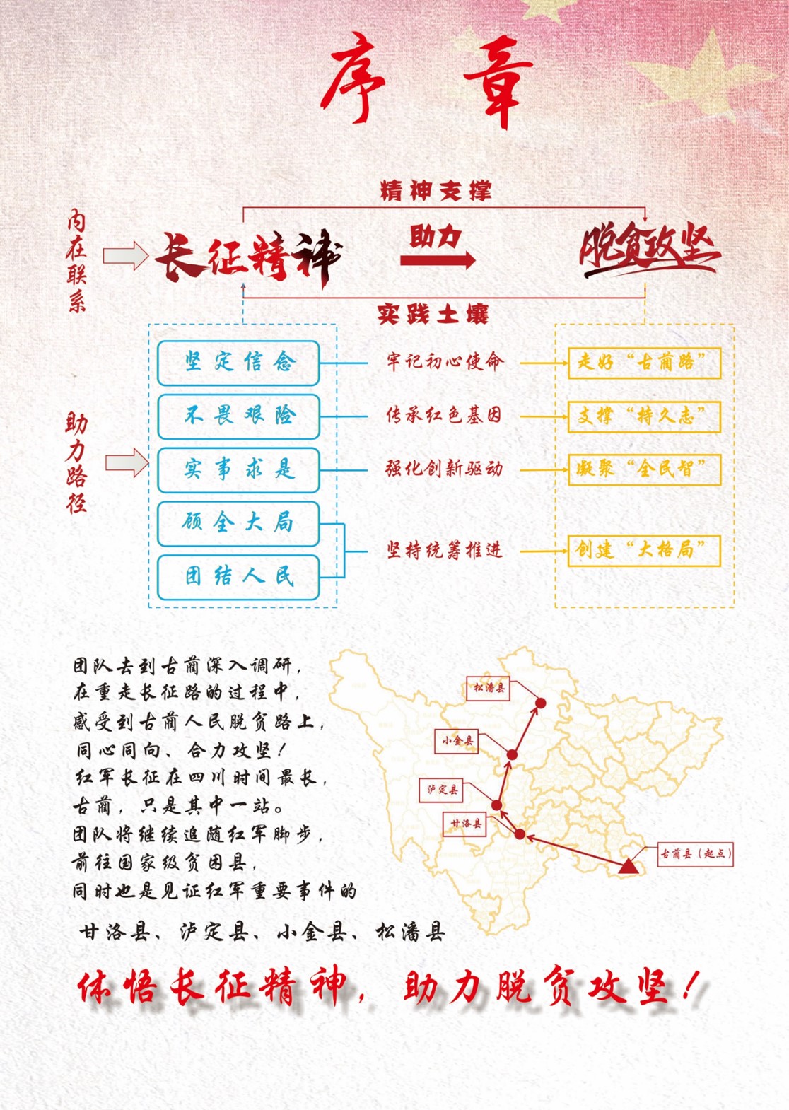 该团队充分利用寒假时间,以古蔺县为主进行前期的调研与采访联系。设计调查问卷与访谈提纲之后,在线上对古蔺县太平古镇景区徐主任、古蔺县县委宣传部工作人员、古蔺县人力资源和社会保障局工作人员、古蔺县扶贫开发局工作人员以及多位驻村扶贫干部进行线上深入访谈调研。分别于2021年2月23日至2月24日和3月19日至3月21日,该团队前往国家级贫困县四川省泸州市古蔺县及周边村落进行走访调研,拍摄了大量相关视频资料,并结合文献资料展开分析,完成了调研报告的撰写与完善。为了使深化作品的研究价值,团队作出之后以“甘洛县→泸定县→小金县→松潘县”为线路的调研计划,进一步研究长征精神对脱贫攻坚的引领作用。