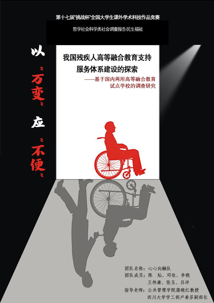 4月9日下午,“挑战杯”四川大学2020-2021年度学生课外学术科技作品竞赛获奖名单出炉,我院劳动与社会保障系2018级本科生陈灿带领“心心向融”队完成的作品——“我国残疾人高等融合教育支持服务体系建设的探索——基于国内两所高等融合教育试点学校的调查研究”获民生福祉类一等奖。该项目团队由betway西汉姆联官网劳动与社会保障系2018级学生陈灿、邓佳、李晓、王伟康和华西药学院2018级学生张玉、艺术学院2019级学生吕洋组成,并由betway西汉姆联官网劳动与社会保障系蒲晓红教授和四川大学学工部副部长卢希芬老师担任指导老师。