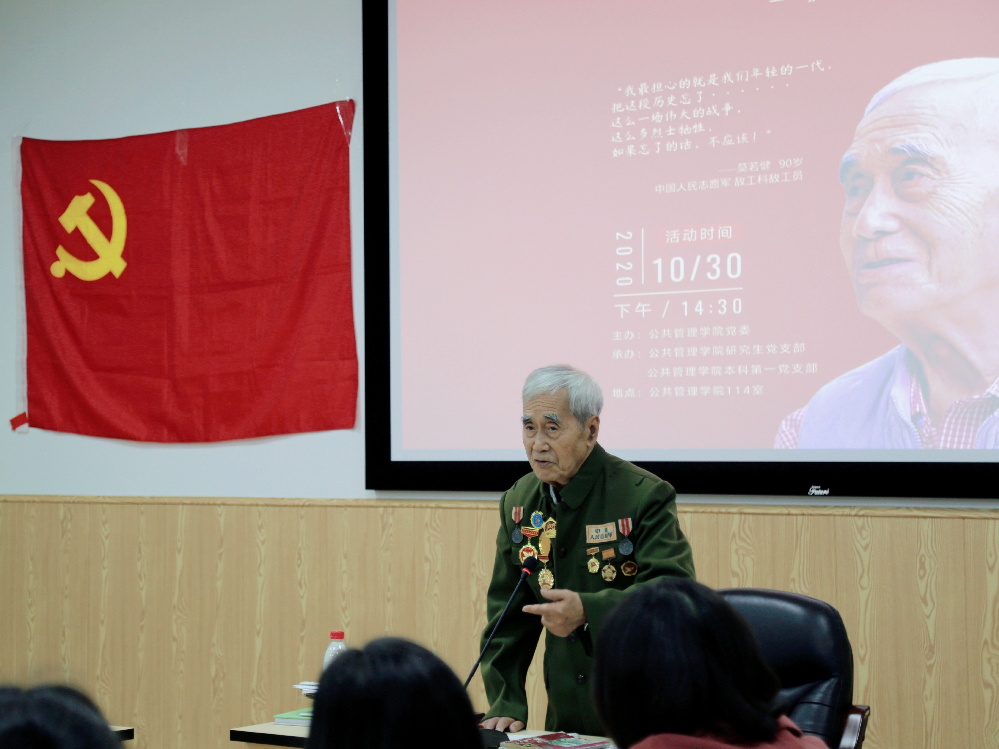 在罗亚玲副院长的介绍下,90高寿的莫若健老先生身着军装与勋功章,手拿记载他一生传奇的书籍和报纸,步伐坚定地走向讲台。站定后,莫老开心地向大家敬礼,在大家的掌声中开始了他的分享。90分钟的分享莫老全程站着讲完,动容之处不禁哽咽落泪,每一个细节都在传递着那段历史于个人于国家的重量。