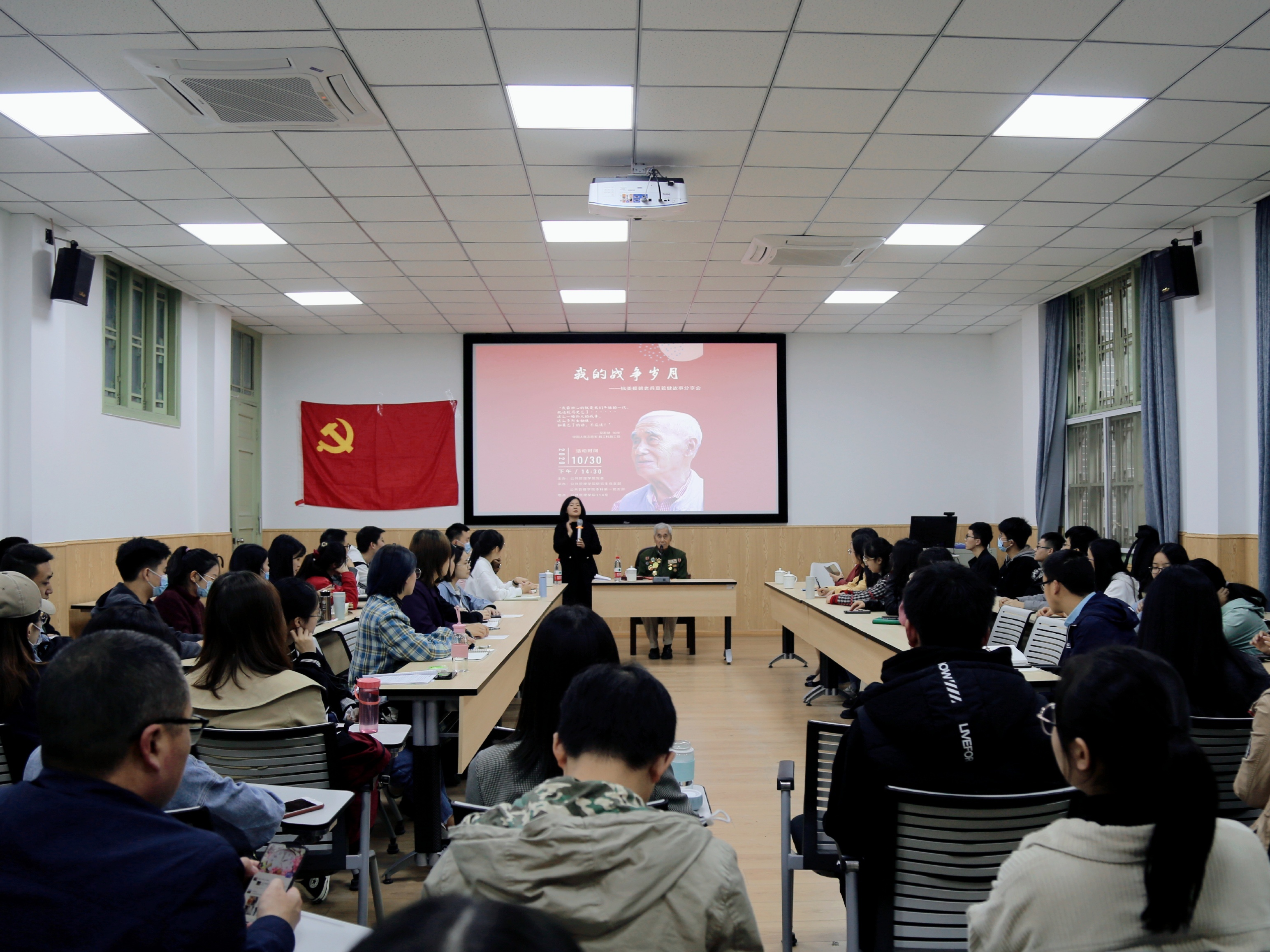 2020年10月30日下午2:30,betway西汉姆联官网“我的战争岁月——抗美援朝老兵莫若健故事分享会”主题党日活动在萃文楼114室成功举办,活动由betway西汉姆联官网副院长罗亚玲主持,学院专职组织员、2019级研究生第四党支部书记廖海燕,2020级研究生辅导员、本科第一党支部书记陈萱源和部分学生党员参加了此次活动。