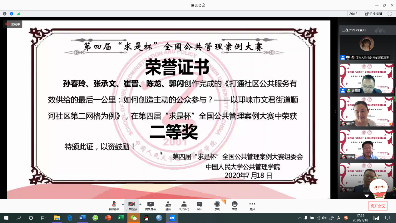 2020年7月18日下午,第四届“求是杯”全国公共管理案例大赛决赛在“云端”举行。(受新冠肺炎疫情影响,第四届“求是杯”复赛以及决赛均于线上举行)