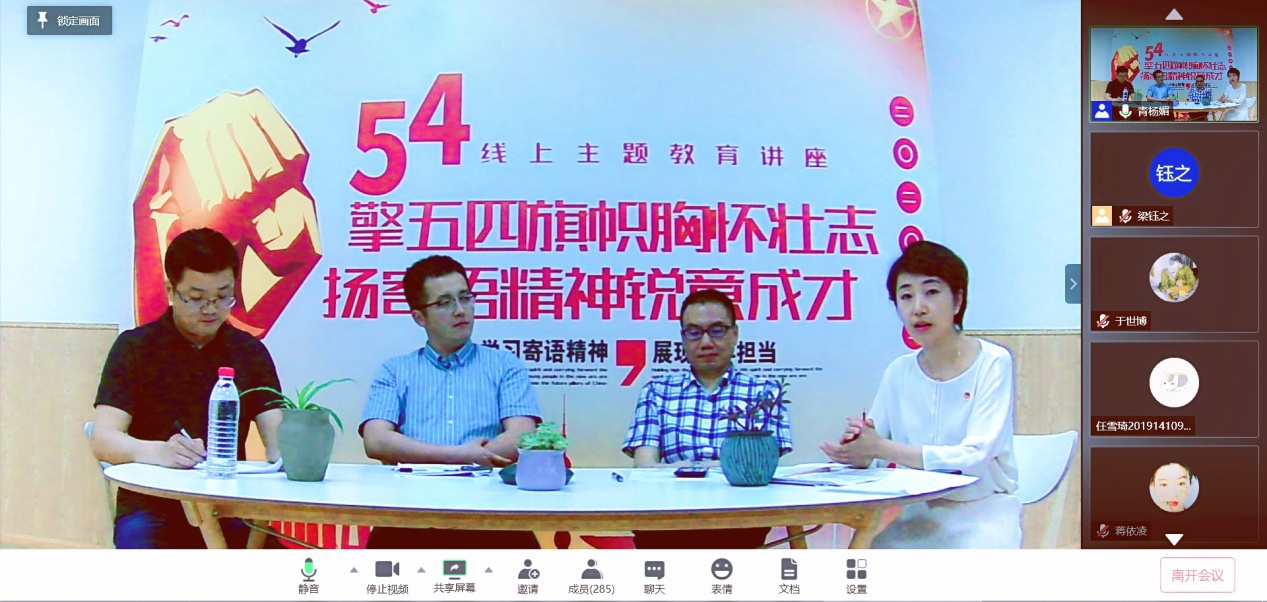 习近平总书记在今年的五四青年节之际亲切寄语全国各族青年,充分肯定青年一代在抗击疫情中展现出的精神风貌和担当作为,对当代青年成长成才提出了殷切期望。为充分学习寄语精神,努力展现青年担当,2020年5月29日14:00-15:30,由betway西汉姆联官网团委主办,艺术学院团委、哲学系团委、国际关系学院团委、机械工程学院团委协办的“擎五四旗帜胸怀壮志,扬寄语精神锐意成才”主题讲座在“腾讯会议”线上平台顺利举办。讲座由betway西汉姆联官网党委副书记杨磊老师主持,邀请四川省团委办公室副主任张建强老师,四川大学马克思主义学院杜黎明教授,四川大学团委副书记黄菲娅老师莅临直播间,五院(系)近300名团员同学们踊跃参加,反响强烈。