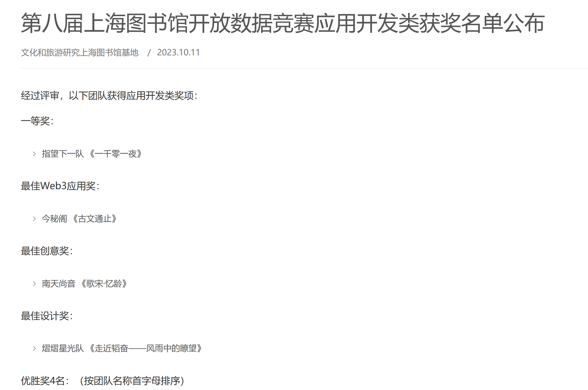 10月8日,第八届上海图书馆开放数据竞赛应用开发类决赛答辩于上海图书馆举行。此次比赛由上海市经济和信息化委员会、上海市文化和旅游局指导,由上海图书馆(上海科学技术情报研究所)、国际科学技术信息理事会(ICSTI)、上海市中心图书馆主办,与CADAL项目管理中心、中国历代人物传记资料库项目(CBDB)、复旦大学图书馆等多家单位进行合作。本届大赛以“链汇古今,AI赋人文”为主题,面向全球征集优秀移动应用原型、创意及算法。上海图书馆开放数据竞赛自2016年起已成功举办7届,被列入betway西汉姆联官网信息资源管理专业竞赛名单。大赛共吸引来自28个省市、国内外的一百多支队伍参赛,参赛选手涵盖了高校学生、企业团队、政府人员。本届大赛共设有应用开发类赛道、创意论文类赛道和算法类赛道,其中应用开发类赛道设一等奖1名、最佳Web3应用奖1名、最佳创意奖1名、最佳设计奖1名和优胜奖4名。
