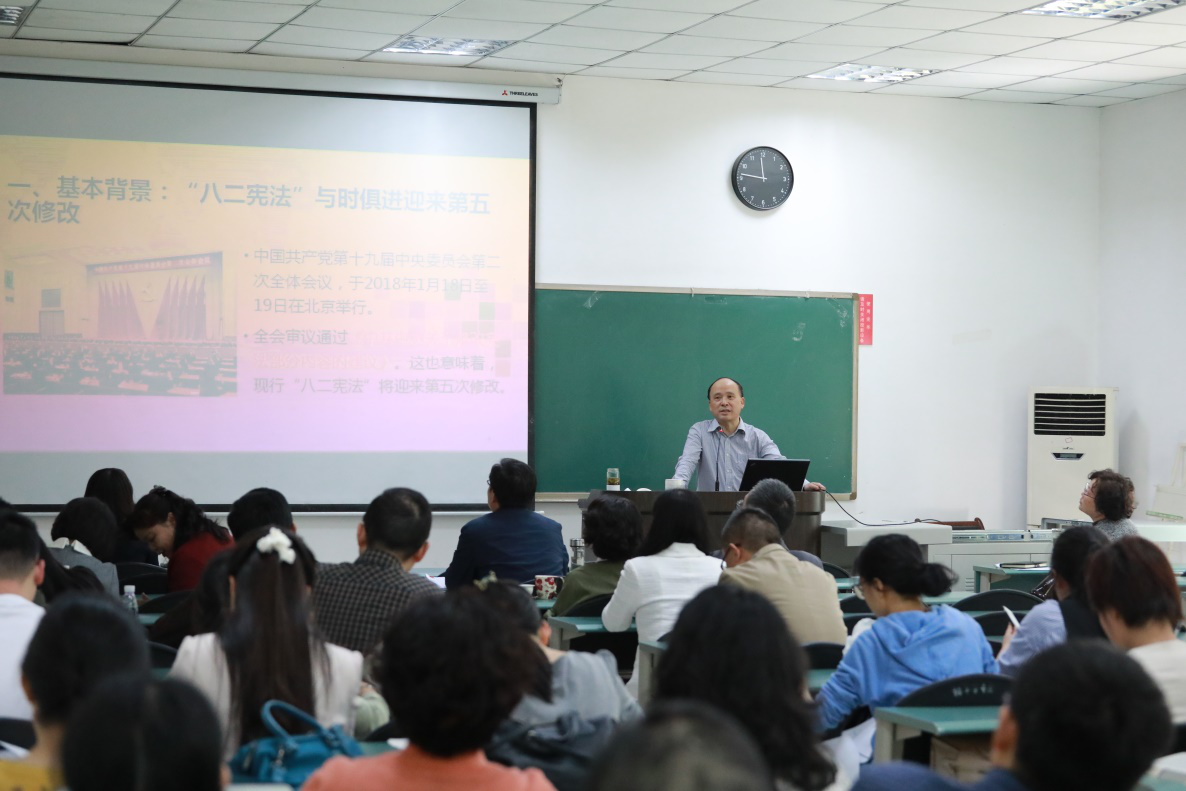 5月11日下午,我院邀请了全国知名法学专家、四川大学法学院院长左卫民教授在萃文楼106室作了《宪法修改和监察体制改革》专题讲座。讲座由学院党委书记姜晓萍教授主持,学院全体教职工党员参加了本次课程。